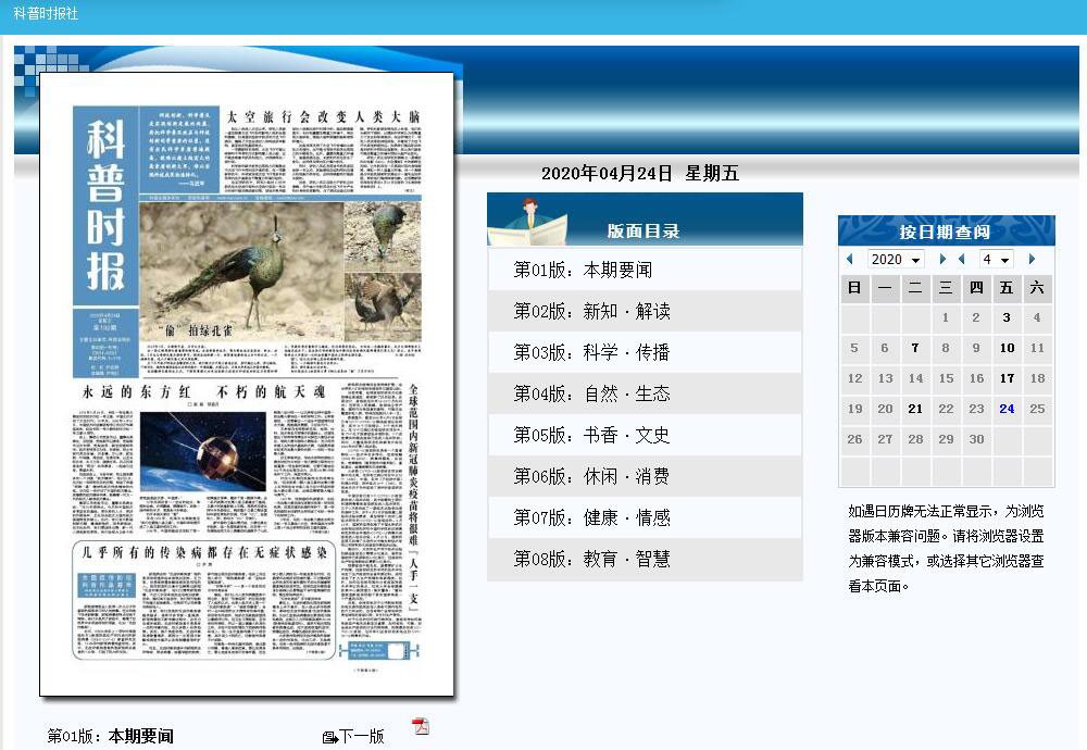 | 网站简介: 科普时报电子版,科普时报多媒体数字报。《科普时报》由科技日报社主办,其前身系中华人民共和国科学技术部主管的《科技文摘报》,于1993年创刊。与中国科普网、《中国科技财富》、《大学生科技报》、《科普画王》共同构成科普全媒体平台。全新的《科普时报》,是全国第一份综合性科普周报,以提高全民科学素养为使命,面向大众传播科学知识、科学方法、科学精神和科学思想。 |