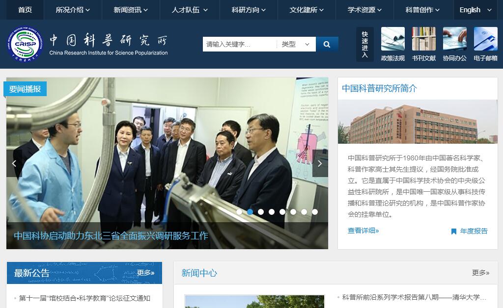 | 网站简介: 中国科普研究所于1980年由中国著名科学家、科普作家高士其先生提议,经国务院批准成立。它是直属于中国科学技术协会的中央级公益性科研院所,是中国唯一国家级从事科技传播和科普理论研究的机构,是中国科普作家协会的挂靠单位。中国科普研究所主要研究范围包括科技传播对象、内容、渠道及机制等理论研究,公众科学素养的调查、监测和分析,科普效果评估,青少年创造能力培养的调查及理论研究,科技科普教育的理论研究,国外科技传播研究,国内外科普作品和作家研究等。中国科普研究所下设科普理论研究室、科学素质研究室、科普政策研究室、科学媒介研究室、科普创作研究室(中国科普作家协会秘书处)、科普文献编辑室、人事处和办公室,内设中国科学探索中心和科普监测与评估中心,编辑出版《科普研究》《科普创作》期刊。近年来,中国科普研究所每年都承担40多项研究课题,并与国外多家机构建立合作关系,在“公众科学素养调查”、“科普效果评估”、“科普资源调查机相关理论研究”等方面开展了一系列研究工作,取得了丰硕的成果,为政府制定科普政策提供了决策依据,为科协和社会的科普实践提供了理论服务。 |