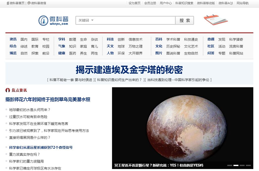 | 网站简介: 微科普,是专注于科普知识传播的高层次科普网站。微科普以分享科普知识为宗旨,致力于构建权威的科普知识数据库,以“成为中国科普网站中的一面镜子”为出发点,提供负责任、有趣、权威的科普知识,向关注中国科普类资讯的公众提供科普知识的传播与服务。微科普是《全球智慧数据平台(GSD)》数据源网站,据《新闻研究导刊》的相关文献报道,微科普与果壳网、科学松鼠会一起并称为我国三大科普网站。 |