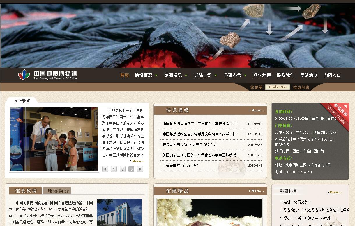 中国地质博物馆创建于1916年,在与中国现代科学同步发展的历程中,积淀了丰厚的自然精华和无形资产,以典藏系统、成果丰硕、陈列精美称雄于亚洲同类博物馆,并在世界范围内享有盛誉。中国地质博物馆收藏地质标本20余万件,涵盖地学各个领域。其中有蜚声海内外的巨型山东龙、中华龙鸟等恐龙系列化石,北京人、元谋人、山顶洞人等著名古人类化石,以及大量集科学价值与观赏价值于一身的鱼类、鸟类、昆虫等珍贵史前生物化石;有世界最大的“水晶王”、巨型萤石方解石晶簇标本、精美的蓝铜矿、辰砂、雄黄、雌黄、白钨矿、辉锑矿等中国特色矿物标本,以及种类繁多的宝石、玉石等一批国宝级珍品。中国地质博物馆在开展藏品科学研究的同时,长期从事地层古生物学、矿物岩石学、宝石学和博物馆学的研究并取得累累硕果,特别是在早期脊椎动物学、昆虫学以及辽西热河生物群等研究领域所取得的成果受到国内外科学界的广泛关注;以系统精美的宝石陈列,独到的宝石研究成果,持续的社会推广活动,带动和引导了当代中国宝石科学研究、知识普及和市场消费。中国地质博物馆常年开放独具特色的陈列展览。按照地球圈层结构布局的基本陈列,不仅展示了数以万计的矿物、岩石、宝石、化石精品,陈列内容更加关注人类的生存环境和生存质量;而且大量采用数字化、仿生、虚拟现实等技术,让观众在浓郁的科学氛围中,通过亲眼目睹、亲手操作和亲身体验,轻松步入精彩纷呈的地学空间。中国地质博物馆长期开展丰富多彩的社会教育活动。创刊于1981年的《地球》是中国唯一的地学科普杂志,一年一度的全国青少年地学夏令营已成为社会教育活动的重要品牌,科普讲座、科普巡展、科普咨询等各种地学科普活动连绵不绝,使中国地质博物馆的社会影响力不断增强。目前,中国地质博物馆正以昂扬的精神风貌,继往开来,精心打造美好未来。