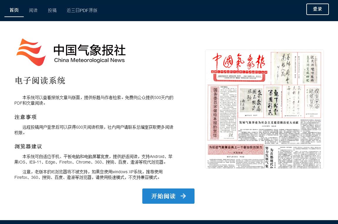 | 网站简介: 中国气象报电子阅读系统可以查看报纸文章与版面,提供标题与作者检索。免费向公众提供500天内的PDF和文章阅读。 |