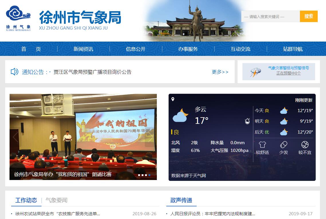 徐州市气象局成立于1957年。经过半个世纪的发展,现已成为集社会管理、气象业务和气象服务于一体的现代化市局。全市气象系统现有在职职工126人。大专学历68人,本科学历21人,硕士研究生6人。具有高级职称11人,中级职称90人。市局领导班子成员4人。市局下辖1个国家气候观象台和7个县(市、区)气象局(其中2个国家1级观测站,3个国家2级观测站);市局内设3个行政处室、4个事业单位。其主要职责是:1.负责本行政区域内气象事业发展规划、计划的制定及气象业务建设的组织实施;对本行政区域内的气象活动进行指导、监督和行业管理。2.管理、制定人工影响天气作业方案,在本级人民政府的领导和协调下指导和组织人工影响天气作业,指导县级人工影响天气作业;组织管理雷电灾害防御工作,会同有关部门指导对可能遭受袭击的建筑物、构筑物和其它设施安装的雷电灾害防护装置的检测工作;负责本行政区域内雷电灾害防护装置的设计审核和竣工验收;负责管理本行政区域内的施放气球活动。3.负责向本级人民政府和同级有关部门提出利用、保护气候资源和推广应用气候资源区划等成果的建议;组织对气候资源开发利用项目进行气候可行性论证。4.负责本行政区域内的气象台站和气象设施的审查、组织建设和维护管理;组织管理本行政区域内气象探测资料的采集、汇总和传输;依法保护气象设施和探测环境;负责审查建设项目大气环境影响评价所使用的气象资料。5.负责本行政区域内的气象监测、预报预警和公共气象服务管理工作,及时提出气象灾害防御措施,并对重大气象灾害进行评估,为本级人民政府组织防御气象灾害提供决策依据;管理本行政区域内公众气象预报、灾害性天气警报以及农业气象预报、城市环境气象预报、火险气象等级预报等专业气象预报的发布。6.组织开展气象法制宣传教育,负责监督有关气象法律法规的实施,对违反《中华人民共和国气象法》等法律法规有关规定的行为依法进行处罚,承担有关行政复议和行政诉讼。7.统一领导和管理本行政区域内气象部门的计划财务、人事劳动、科研和培训以及业务建设等工作;会同县(市)人民政府对县(市)气象主管机构实施以部门为主的双重管理;会同地方党委和人民政府做好当地气象部门的精神文明建设和思想政治工作。8.承担江苏省气象局和徐州市人民政府交办的其他事项。