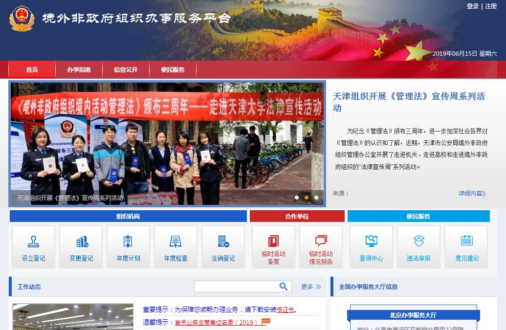 | 网站简介: 境外非政府组织办事服务平台由公安部境外非政府组织管理办公室主办,面向社会提供境外非政府组织管理政策法规发布、预约申请、资料提交、登记信息查询、违法举报等便民服务。境外非政府组织办事服务平台于2016年12月24日试开通,2017年1月1日正式开通。欢迎广大公众对本网站建设积极献计献策,提出宝贵意见和建议。 |