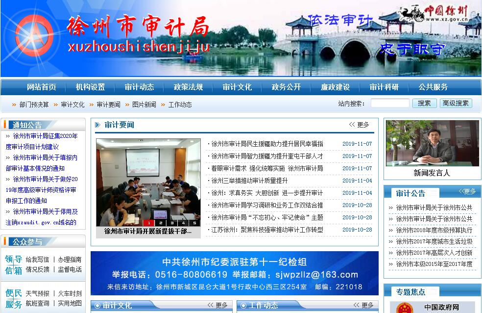 1983年8月,徐州市人民政府根据《中华人民共和国宪法》中有关国家实行审计监督的规定成立徐州市审计局。内设机构有办公室、人事处、监察处、法规处、计算机审计处、财政金融审计处、企业审计处、行政事业审计处、社会保障审计处、固定资产投资审计处、外资运用审计处、农业与资源环保审计处、内部审计与经济责任审计处、城市土地经营审计处等14个处室。按照《中华人民共和国审计法》的规定,徐州市审计局是徐州市依法独立行使审计监督权的审计机关,在市长和省审计厅领导下,负责徐州市的审计工作,主要履行以下职责:一、拟订徐州市审计政策;起草徐州市审计方面的地方性法规、规章草案;制订徐州市审计规章制度并监督执行情况。二、向市政府报告和向市政府有关部门通报审计情况;提出制订和完善徐州市有关政策法规、措施的建议。三、依据《中华人民共和国审计法》的规定,直接进行下列审计:(一)本级预算执行情况和其他财政收支。(二)市政府各部门、市属事业单位及其下属单位的财务收支。(三)县、区政府预算的执行情况和决算。(四)徐州市国有金融机构的资产、负债和损益状况。(五)徐州市国有重点大中型企业、与国计民生有重大关系的国有企业、接受财政补贴较多或者亏损数额较大的国有企业、国有资产占控股地位或者主导地位的企业、市政府指定的其他国有企业的资产、负债、损益状况。(六)国家投资建设项目预算的执行情况和决算。(七)市政府各部门管理的和受市政府委托由社会团体管理的社会保障基金、环境保护资金、社会捐赠资金及其他有关基金、资金的财务收支。(八)根据审计署授权,审计国际组织和外国政府援助、贷款项目的财务收支。(九)其他法律、法规规定应由市审计局进行的审计。四、向市政府提出徐州市预算执行情况的审计结果报告;受市政府委托向市人大常委会提出徐州市预算执行情况和其他财政收支审计工作报告。五、组织实施对贯彻执行徐州市财经政策和措施情况的行业审计、专项审计和审计调查。六、组织实施对徐州市区县级以下领导干部和国有企业及国有控股企业领导人员的任期经济责任审计。七、依法受理被审计单位对审计机关审计决定的复议申请。八、组织领导、协调监督县区审计机关的业务;与县、区政府共同领导县、区审计机关,协同办理县、区审计机关正、副职负责人的任免事项。九、组织实施对内部审计的指导和监督;组织实施对社会审计组织审计业务质量的监督检查。十、根据审计署授权,依法审计中央在徐单位的财务收支情况。十一、承办市政府交办的其他事项。在实施审计监督过程中,为了提高审计工作效率与质量,徐州市审计局正在积极探索和逐步采用系统基础审计和抽样审计等现代审计方法以及电子计算机现代审计技术手段。徐州市审计局在维护徐州经济秩序,促进廉政建设,保障徐州经济建设等方面发挥了重要作用。