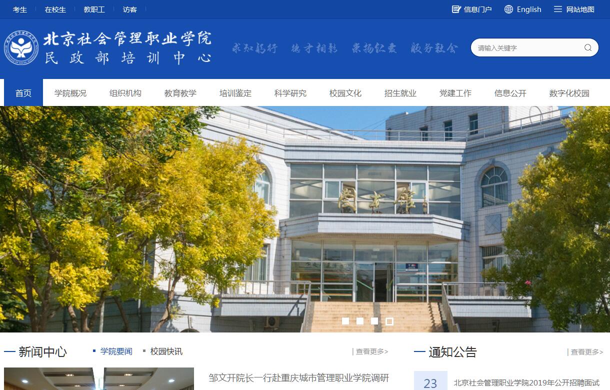 为积极适应经济社会建设和民政事业快速发展的需要,2007年在民政部党组的科学决策下,北京社会管理职业学院在民政部管理干部学院基础上成立,民政部培训中心、民政部职业技能鉴定指导中心和民政部社会工作研究中心同时设在学院,主要承担社会管理和社会服务类高等职业教育、全国民政系统干部职工教育培训、民政职业技能鉴定、民政政策理论和社会工作研究等职能。建院以来,学院按照“质量立校、人才兴校、特色办学、协调发展”的思路,以民政行业为依托,以服务社会为使命,适应市场、开放办学,各项工作取得了快速发展,整体办学水平和社会影响力显著提升,为民政事业发展及社会建设提供了有力的人才保证和智力支持。被誉为“民政干部的摇篮”,被人力资源和社会保障部批准为国家级专业技术人员继续教育基地,获得“国家技能人才突出贡献单位”、“中央机关文明单位”等20多项荣誉。学院地处经济社会发达、文化底蕴深厚的首都北京,建有燕郊和大兴两个校区,总占地面积906亩。其中,燕郊校区占地310亩,建有体育馆、图书馆和包括部级重点实训室在内的10多个实训中心、60多个实训室,教学实训设施功能齐全、设备先进,在国内同类院校中处于领先地位。现有在校学生3000余名、教职工290多人,其中高级职称教师占45%以上,具有博士或硕士学位的占80%以上,双师比例达70%以上,师资队伍结构合理、素质优良、基础理论扎实、教学实践能力突出,先后有多名教师荣获“国家技能人才突出贡献奖”及被评为“北京市教学名师”。在建的大兴校区位于北京新兴的高校聚集区,占地596亩,建成后将是一所集现代化、数字化、园林化为一体充满活力和时代气息的新校园。学院立足民政、面向社会,设有护理(全科护理)、老年服务与管理、物业管理、民政管理(彩票营销与管理)、婚庆服务与管理、社会工作(救助社工、社区社工)、人力资源管理、公益慈善事业管理、学前教育(0-3岁早教、普通幼儿教育、特殊儿童教育)、现代殡葬技术与管理、园林技术、假肢与矫形器技术、康复辅助器具技术、康复治疗技术等17个涵盖民政各个领域、社会亟需的特色专业及专业方向,为国家培养和输送了大批高素质的社会管理和社会服务类技能型人才。学院坚持实行开放式办学战略,先后与20多家企事业单位、行业机构建立“合作研发、合作育人、合作就业” 人才培养机制,与美国、加拿大、英国、德国、挪威、澳大利亚、新西兰、日本、香港、台湾等国家或地区的20余所高校建立校际交流和合作关系,定期开展师生互访和培训活动,并探索实施“2+2”、“3+1”等多种学生赴海外培养渠道,着力培养具有国际视野的高水平技能型人才。毕业生获得毕业证书和职业资格证书的比率达98%以上,一次就业率达96%以上,推荐专升本比率达15%以上、录取率达>70%以上,人才培养质量和水平得到教育部、北京市教委的充分肯定和社会的广泛认可。学院大力拓展各类奖励和资助渠道,形成了完善的“国家—学院—社会”立体化的三级奖助学金帮扶体系。在校生可获得国家奖学金、励志奖学金、国家助学金,学院入学奖(助)学金、贫困补助以及天津鹤童奖学金、德法利奖学金、天津医养奖学金、社会福利基金会、华民慈善就业扶助项目等20多项社会专项奖助。其中,最高单项奖励金额达8000元年,一学年可累计获得最高奖助额21000元。奖助学金面覆盖全院50%以上的优秀学生和100%的困难学生,有效激发广大学生的学习热情,有力保障贫困学子圆梦大学。当前,国家高度重视保障和改善民生、加强和创新社会管理,2012年3月国务院召开的第十三次全国民政会议明确提出“民政要在社会建设中发挥骨干作用”。学院作为民政部直属院校,是国家民政人才教育培养的主阵地和主渠道,面临着良好的发展机遇和广阔的发展前景,欢迎广大考生踊跃报考北京社会管理职业学院,为推动民政事业科学发展、促进和谐社会建设做出积极贡献。