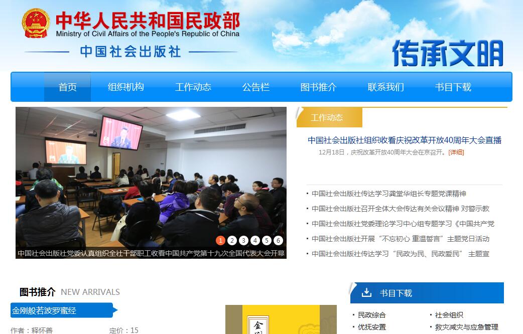 中国社会出版社成立于1989年7月,为民政部主管、财政部代表国务院履行出资人职责的国有独资中央文化企业,国家一级出版社、全国百佳图书出版单位。出版物以社会建设领域的图书为主体,以城乡社区居民读物、老年读物和民俗类图书为重点,涉及基层政权和社区建设、社会工作、社会组织、社会救助、社会福利(包括福利彩票、慈善事业、社会捐助、老年人和残疾人福利、儿童福利和儿童收养)、社会事务(包括婚姻、殡葬、生活无着人员救助)、老龄事业、减灾救灾、优抚安置、行政区划和地名、边界管理、难民安置、新农村建设等业务范畴和社会、经济、政治、法律、文化、历史、文学、教育、农业、伦理、哲学等学科领域。年均出版各类新书500种左右,重版率在50%以上,在销图书4000多种,多种图书在国际、国内获奖。中国社会出版社现有员工90人,其中具有中级以上专业技术职务的专业人才50多人,1人入选全国新闻出版行业领军人才。从2003年开始,中国社会出版社参与了由民政部、中央文明办、新闻出版总署、国家广电总局发起主办(2007年文化部、中国作家协会加入)的“万家社区图书室援建和万家社区读书活动”,承担图书室援建任务。截至2015年底,共援建城乡社区图书室18.5万家,援建图书6850余万册,使4亿多城乡居民从中受益,成为农村文化建设的一个知名品牌,受到城乡居民的广泛好评,被社会各界誉为一项得民心、聚民心、暖民心的民心工程,中央领导刘云山、回良玉曾作出重要批示,给予充分肯定。