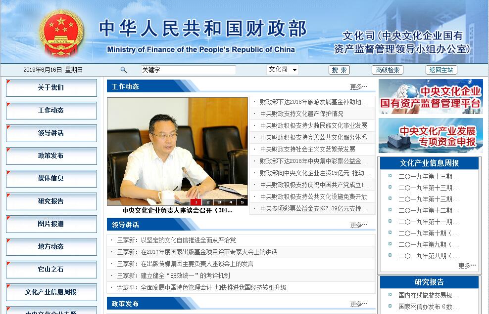 | 网站简介: 财政部文化司(中央文化企业国有资产监督管理领导小组办公室)主要职责:研究提出支持文化改革与发展相关财政政策;承担宣传、文化、体育、旅游等方面的部门预算和相关财政资金、资产管理工作,拟订相关行业事业单位财务管理制度,负责旅游发展基金预算管理;承担由财政部代表国务院履行出资人职责的中央文化企业资产、财务、国有资本经营预决算等工作;承担中央文化企业国有资产监督管理领导小组日常工作。 |