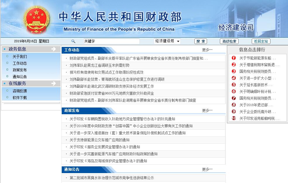 | 网站简介: 财政部经济建设司主要职责:参与研究制定宏观调控、经济运行、结构调整、生态文明建设、经济安全等方面规划和政策。参与财政宏观调控,研究提出政府投资管理、扩大消费政策建议;协调经济运行,参与粮食、棉花、肉、糖、石油等重要商品物资市场调控并承担有关资金管理;参与制定产业政策和行业发展规划,负责制定支持产业升级、促进中小企业发展的财政政策;牵头生态文明财政制度建设,实施促进节能减排、生态环境保护的财政政策;参与制定国家经济安全战略,实施国家能源安全和粮食安全的财政政策。管理工业、交通、商贸、资源环境等领域相关部门预算,及中央基建投资、节能减排、中小企业发展等专项支出。负责有关中央企业预算管理(不含中央企业国有资本经营预算)。履行铁路、邮政企业出资人职责,负责烟草企业国有资产监管。 |
