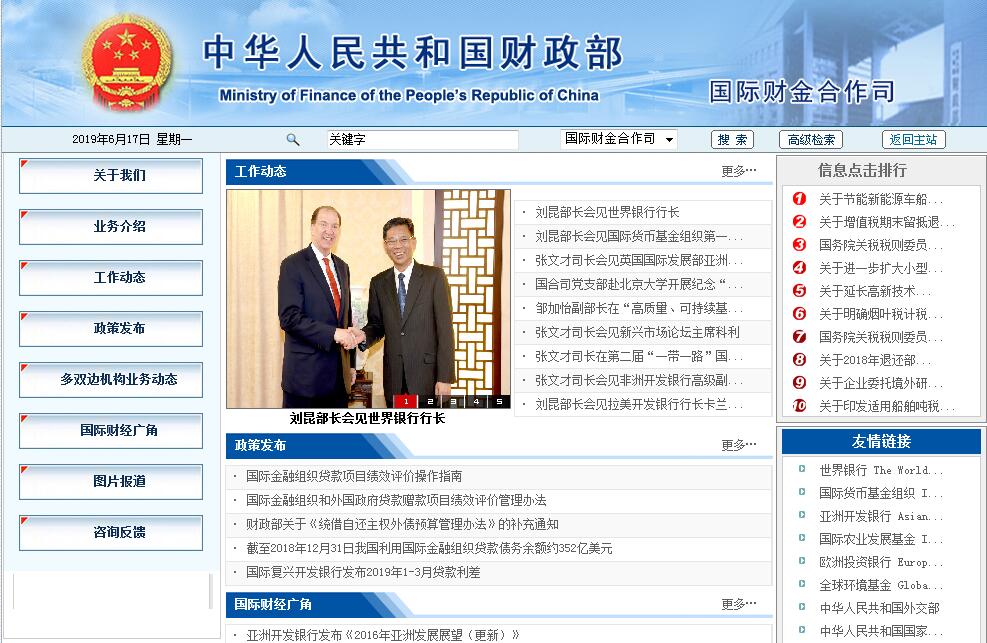 | 网站简介: 财政部国际财金合作司主要职责:研究和分析国际财金合作重大问题和政策;承担有关国际金融组织(国际机构)投融资、技援、经济监测、资金管理等工作;承担有关国际金融组织(国际机构)中国理事和执董会办公室等工作;负责外国政府贷(赠)款的管理工作;承担与有关发展援助机构的合作并参与发展援助政策制定;负责联合国环境公约机制资金议题相关工作。 |