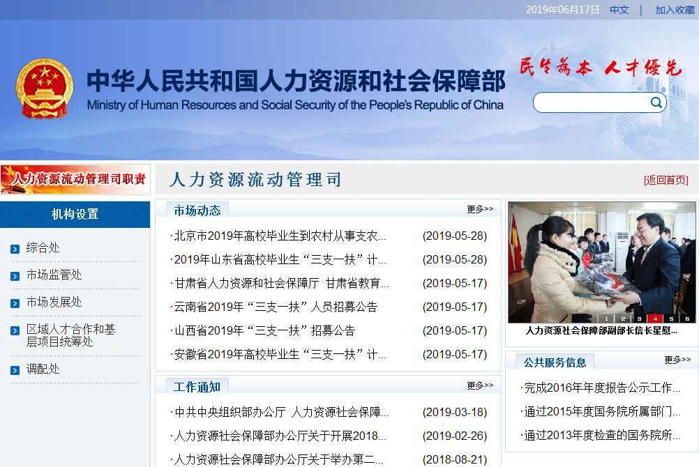 | 网站简介: 人力资源和社会保障部人力资源流动管理司主要职责:拟订人力资源市场发展政策和规划;拟订国(境)外人力资源服务机构市场准入管理制度;指导和监督对职业中介机构的管理;拟订人员调配政策,承办国家特殊需要人员的调配工作;按规定承办中央国家机关及其在京有关单位接收大中专毕业生、从京外调配人员事宜。 |