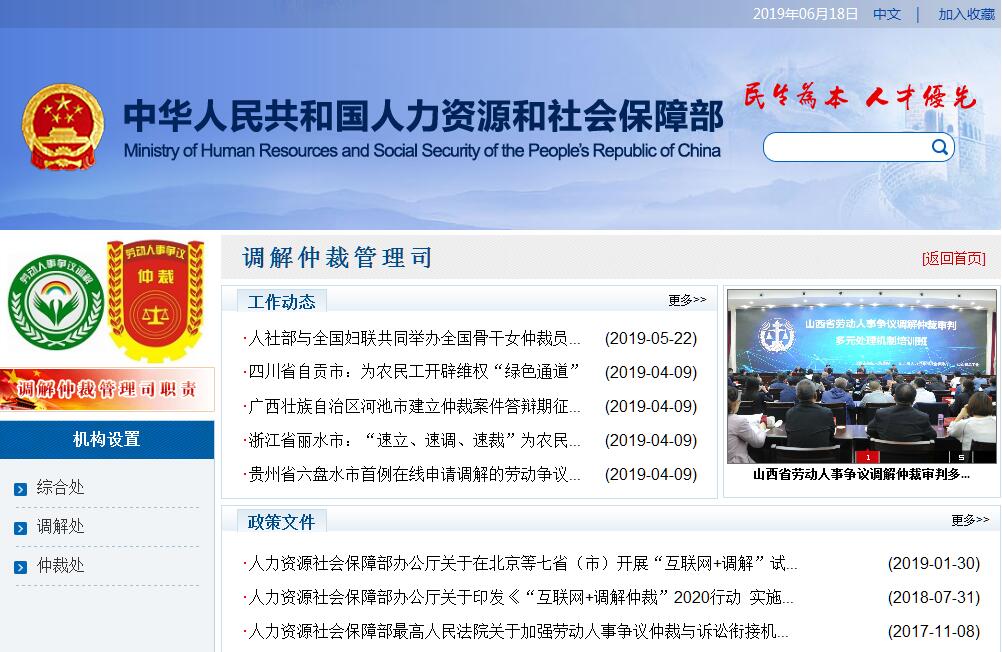 | 网站名称: | 人力资源和社会保障部调解仲裁管理司 | ||