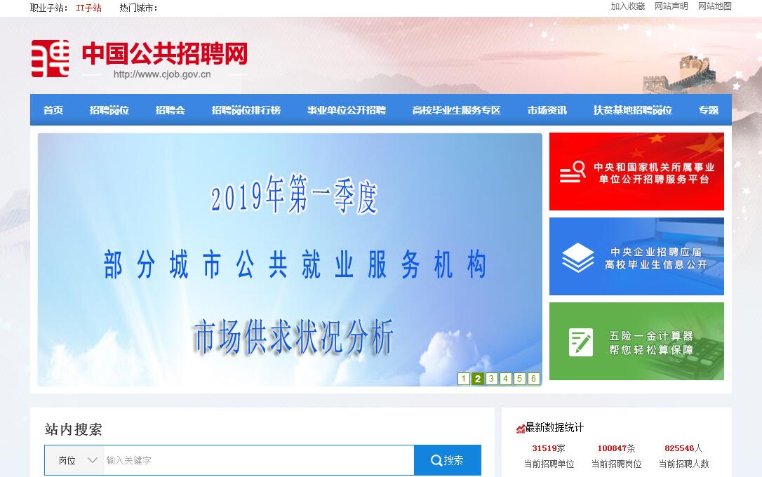 | 网站简介: 中国公共招聘网是人力资源和社会保障部主办的公共就业服务网,于2011年正式开通试运行。2014年,网站进行全新改版,扩展服务信息内容,主要发布招聘信息、招聘会信息、事业单位公开招聘信息、市场资讯等信息。目前已与全国292家公共就业和人才交流服务机构实现联网,涉及31个省,211个地市。日均发布有效招聘岗位信息26万条,包含招聘岗位170万个,招聘会信息500条,用人单位信息5万条。 中国公共招聘网旨在为广大劳动者免费提供“信息真实、内容完整、岗位有效、查询便利”的信息,并以全面、系统、权威的信息内容为提供更加优质高效的就业信息服务。 |