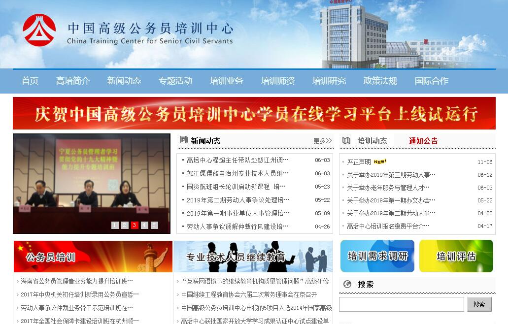 中国高级公务员培训中心(简称高培中心)是人力资源社会保障部直属事业单位,于1988年经国家机构编制委员会批准成立。高培中心主要负责国家公务员、专业技术人员和企事业单位管理人员的有关培训教育工作,开展相关咨询服务与研究开发。高培中心坚持改革,不断创新,采取现代培训技术和手段,拓展培训领域,提高综合培训能力,为政府机关、企事业单位和社会提供优质的培训服务:●承担中央国家机关和各省、自治区、直辖市的公务员初任、任职、专门业务、知识更新培训的有关工作;承担全国人事岗位人员的培训;提供培训业务的咨询和服务。●为专业技术人员和管理干部提供培训与咨询服务,代为设计课程、聘请教师;组织举办高级研修班和专题研修班;组织国际、国内专题研讨活动。●为企事业管理人员的培训提供服务,开展人力资源管理与开发的咨询、研究与培训活动。●为全国人事系统有关出国(境)培训考察业务提供组织与咨询服务;聘请国外知名专家举办专题讲座;承办有关国际会议。●经原人事部批准,高培中心建立了“中国国家人事人才培训网(www.chinanet.gov.cn)”,运用先进技术手段进行网络远程培训教育,并根据中央国家机关与地方的培训需求,设计与开设公务员、专业技术人员与企事业管理人员的网络培训教育课程。●高培中心与国内外一些著名大学、科研院所和培训教育机构开展广泛的交流与合作,联合举办工商管理(MBA)、公共行政管理(MPA)、项目管理(PMP)培训。高培中心本着立足国内、面向世界,学以致用、讲究实效的方针,奉行优质服务、创新发展、广交朋友、合作双赢的原则,竭诚欢迎国内外各界朋友成为我们培训事业的指导者、支持者和合作者。