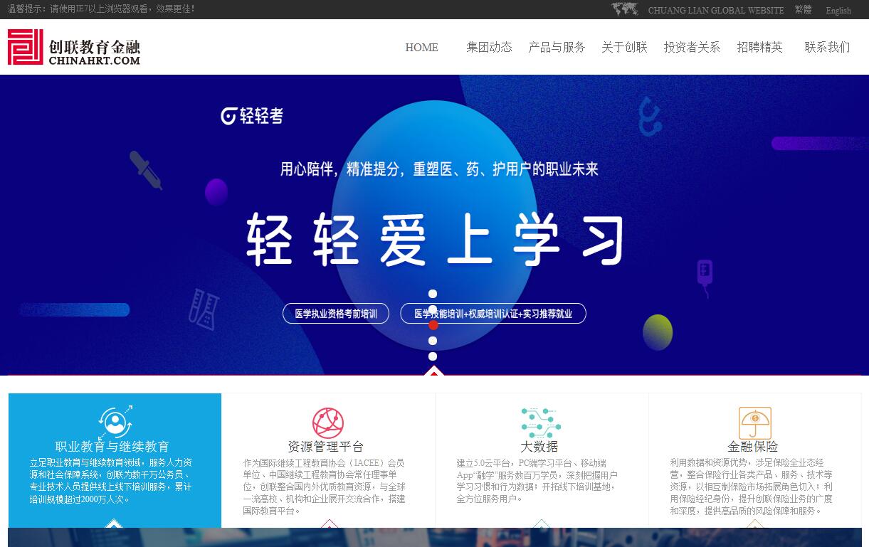 | 网站简介: 创联教育金融集团( HK02371)是一家致力于终身教育、并在全产业链布局的港交所上市企业。公司立足职业教育与继续教育领域,服务于人力资源和社会保障部体系,为中国公务人员、专业技术人员等数千万人群提供线上、线下培训服务。累计培训规模已超过2000万人次。截至2017年底,移动端产品“融学”App用户数超过200万人。 作为国际继续工程教育协会(IACEE)会员单位、中国继续工程教育协会常任理事单位,创联整合国内外优质教育资源,搭建教育资源平台,与全球一流高校、机构和企业展开交流合作,为中国企业、高校输出优质的教育资源。 布局教育、并发力金融保险业务。2016年,创联成为全国首家批筹的信美人寿相互保险社9家主要发起会员之一,于同年收购北京中金保险经纪100%股权,正式进入保险业领域经营。 以三大业务体系为核心,以互联网技术为支撑,以服务用户为使命,创联立志成为中国教育行业独树一帜的领军企业。 |
