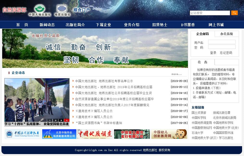 在文化体制改革的推动下,2010年1月,地质出版社和中国大地出版社人员合并重组,由实行企业化管理的事业单位转制全民所有制企业。主管单位和主办机关是国土资源部,出资人为财政部。中国大地出版社、地质出版社内设地质、国土、教育三个专业出版分社;地质出版社作为两个大中型国有印刷企业出资人,领导和管理保定五四三印刷厂、北京地质印刷厂;2011年创办了北京中地开元信息咨询有限责任公司、北京中地垠和物业管理有限责任公司、北京中地华安地质勘查有限公司。共有员工2200多名。中国大地出版社、地质出版社长期高举中国特色社会主义伟大旗帜,坚持以马克思列宁主义、毛泽东思想、邓小平理论和“三个代表”重要思想为指导,深入贯彻落实科学发展观,坚持为人民服务、为社会主义服务发展前进方向,以科学发展为主题,以建设社会主义核心价值体系为根本任务,弘扬以爱国主义为核心的民族精神和以改革创新为核心的时代精神,在国土资源出版产业、教育出版产业领域奋力开拓,辛勤耕耘。全社职工长期坚持“以发展创新为本,以出版物质量为根,以开拓市场营销为源,以持续满足读者需求为魂”的出版质量方针,努力办好让党和政府放心、人民满意的中国大地出版社、地质出版社。地质出版社(副牌:国土资源电子音像出版社),成立于1954年3月。经国家新闻出版总署批准的出版范围是:出版地质勘探、科学研究、教学所需要的地质科技专著、教材以及相关地质专业科技读物;出版中小学教学地图及相关教材,交通旅游专业地图;以“国土资源电子音像出版社”名称出版电子音像出版物、开展互联网出版经营业务。具有全国甲级测绘单位资质和本版出版物广告发布权。 地质出版社在国土资源部以及新闻出版总署的正确领导下,始终坚持“为人民服务,为社会主义服务,为党和国家工作大局服务”的出版工作方针,实施“以地质图书立社、以教学图书兴社、以图书质量名社、以开拓创新强社”的发展战略,走专业化、特色化的发展道路,依托专业出版优势,抓住机遇,走出了一条快速的发展之路。建社58年来,共出版地质专业图书1.4万余种,出版了许多体现全国地质工作者心智结晶、反映地质科学最新成果的一大批地学权威著作。先后有150余种出版物荣获国家级及全国性优秀奖励;连续获得第一届、第二届中国出版政府奖提名奖。连续五届获得国家图书奖,连续两届获得国家电子出版物奖,五次获得国家科学技术进步奖,三次获得中国图书奖,为我国现代地质科学事业做出了重要贡献。地质出版社致力于为国家基础教育服务,多年来,有70余种中小学教材和教学地图通过全国中小学教材审定委员会审查,列入教育部中小学教学用书目录,出版的中小学教材、教辅和教学地图近3亿册,为我国基础教育事业改革发展做出了积极的贡献。自1995年以来,地质出版社一直被新闻出版总署评为“良好出版社”,2004年被新闻出版总署评为“全国服务三农先进出版单位”,自2001年以来,连年被北京市国家税务局授予“诚信纳税A级单位”荣誉证书,2008年通过ISO9001质量管理体系认证,2011年通过ISO9001质量管理体系认证复评。自2002年以来,连续多年全社年度图书出版总码洋2亿元以上,2011年年度出版总码洋实现4.9亿元。中国大地出版社成立于1992年10月,经国家新闻出版总署批准的业务范围是:出版国家土地管理方面的方针、政策、法规,土地管理、土地科学、土地经济学著作、译著;以及上述各类普及读物和工具书,土地管理专业的大中专、职工培训的教材、教学参考书。中国大地出版社、地质出版社坚持“国土资源出版立社,教育出版强社,拓展国土资源服务发展出版社”的发展战略,努力实现国土资源出版、教育出版共同发展的新格局;努力拓展国土资源领域经营性工作和地质工作。全社职工解放思想、与时俱进,适应社会主义市场经济发展的要求,紧紧抓住国家文化体制和事业单位体制改革的的双重重要机遇,重塑市场主体,全面推进体制机制和制度创新,走内涵式科技创新发展道路,通过重组、组建、改制、改造,拓展国土资源领域经营性工作和地质工作,打造一个导向正确、科技创新、竞争力强,具有产业领军性质的国土资源部出版社现代企业集团。