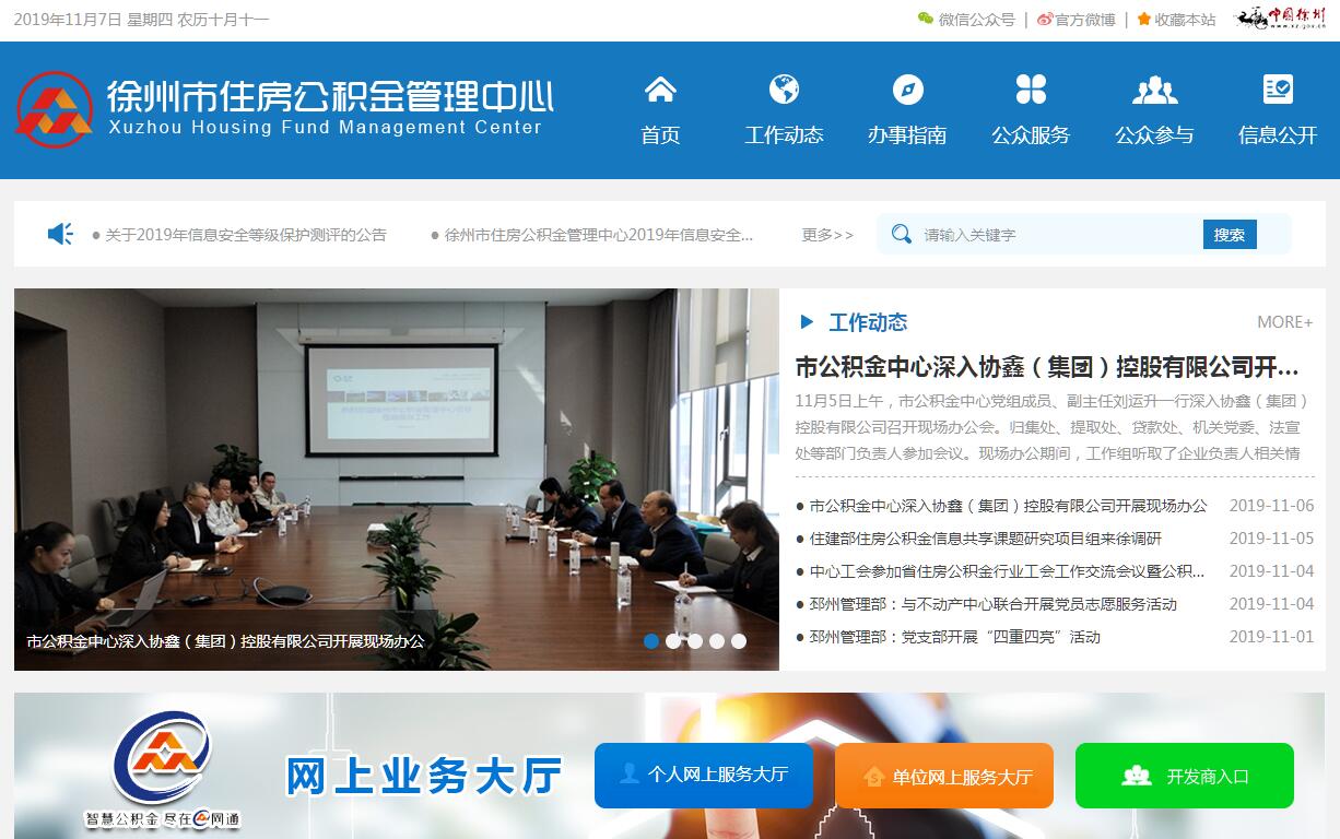 徐州市住房公积金管理中心是直属徐州市人民政府管理的不以营利为目的的独立事业单位;负责对徐州市行政区域内各级行政机关、企事业单位及各行业的单位和个人缴存的住房公积金进行管理的公众资金经营管理机构。徐州市住房公积金管理中心是依据《住房公积金管理条例》(国务院令第 350号)规定,经徐州市委、市政府批准,于 2002年9月组建成立的, 2003年1月正式运行;为直属徐州市人民政府管理的不以营利为目的的独立事业单位;负责对徐州市行政区域内各级行政机关、企事业单位及各行业的单位和个人缴存的住房公积金进行管理的公众资金经营管理机构。 市公积金中心机关内设办公室、法规宣传处、组织人事处、归集管理处、提取管理处、贷款管理处、计划财务处、稽核监管处、信息网络管理处 9个职能处室, 2007年增设中心营业部;并按照属地化管理的原则,分别在丰县、沛县、铜山县、邳州、新沂市、睢宁县、贾汪区、翟山设立8个管理部,各管理部和中心实行统一制度、统一管理、统一核算,具体负责各责任区域内的住房公积金管理工作。多次被江苏省建设厅授予“全省住房公积金管理先进单位”、“全省住房公积金管理归集业务示范单位”和“全省住房公积金管理贷款业务示范单位”,邳州管理部、新沂管理部分别被授予“全省住房公积金管理优秀管理部”。