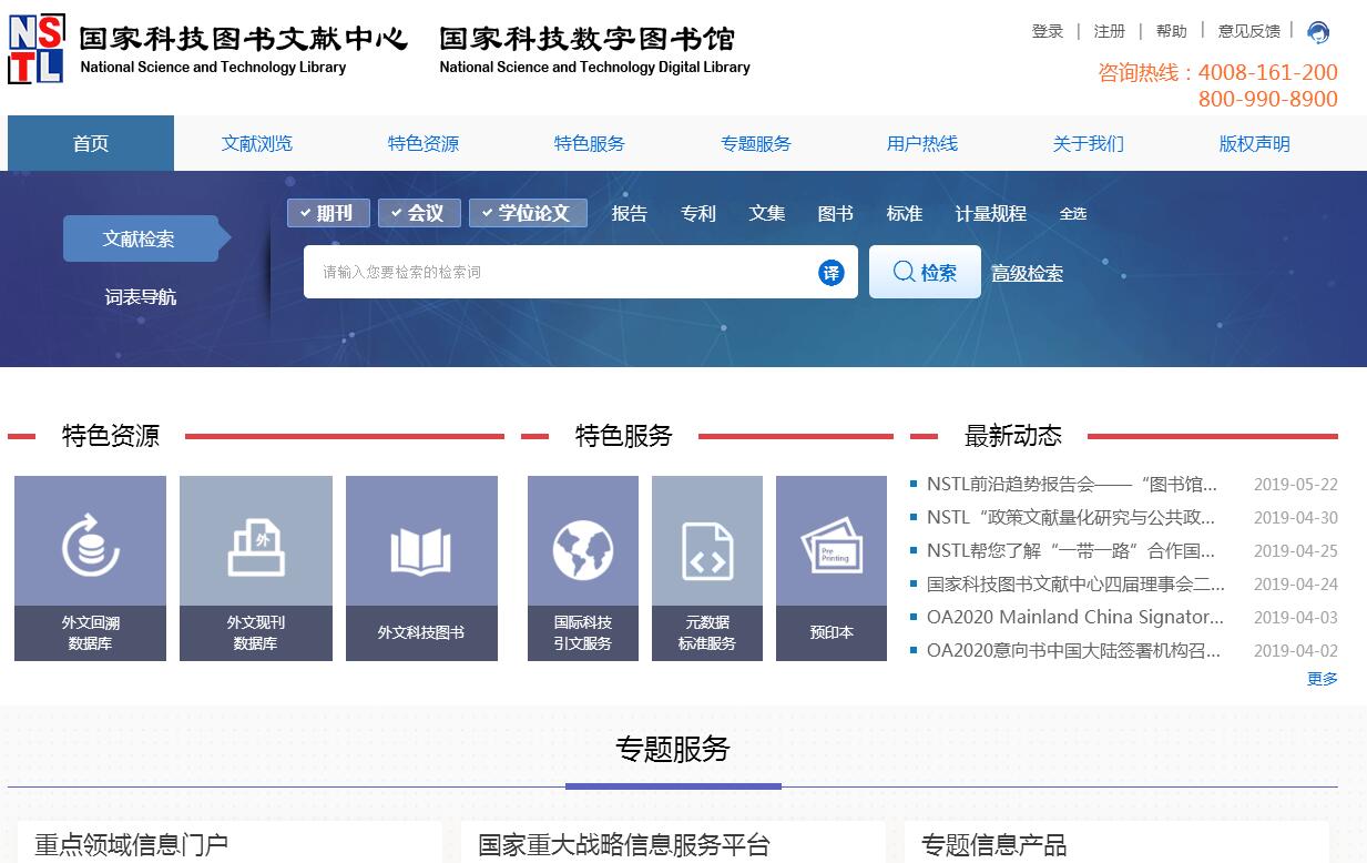 | 网站简介: 国家科技图书文献中心(National Science and Technology Library [NSTL],以下简称中心)是科技部联合财政部等六部门,经国务院领导批准,于2000年6月12日成立的一个基于网络环境的科技文献信息资源服务机构。由中国科学院文献情报中心、中国科学技术信息研究所、机械工业信息研究院、冶金工业信息标准研究院、中国化工信息中心、中国农业科学院农业信息研究所、中国医学科学院医学信息研究所、中国标准化研究院标准馆和中国计量科学研究院文献馆九个文献信息机构组成。中心以构建数字时代的国家科技文献资源战略保障服务体系为宗旨,按照“统一采购、规范加工、联合上网、资源共享”的机制,采集、收藏和开发理、工、农、医各学科领域的科技文献资源,面向全国提供公益的、普惠的科技文献信息服务。 |