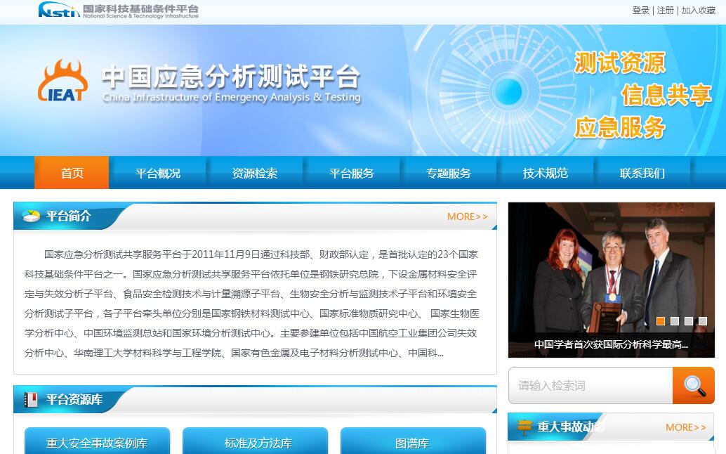 国家应急分析测试共享服务平台于2011年11月9日通过科技部、财政部认定,是首批认定的23个国家科技基础条件平台之一。国家应急分析测试共享服务平台依托单位是钢铁研究总院,下设金属材料安全评定与失效分析子平台、食品安全检测技术与计量溯源子平台、生物安全分析与监测技术子平台和环境安全分析测试子平台,各子平台牵头单位分别是国家钢铁材料测试中心、国家标准物质研究中心、 国家生物医学分析中心、中国环境监测总站和国家环境分析测试中心。主要参建单位包括中国航空工业集团公司失效分析中心、华南理工大学材料科学与工程学院、国家有色金属及电子材料分析测试中心、中国科学院金属研究所失效分析中心、山东省材料失效分析与安全评估工程技术中心、北京市理化分析测试中心等。 国家应急分析测试共享服务平台是国家科技基础条件平台子项目《全国分析测试中心协作平台及应急分析测试系统的建立》的建设成果,是以国家重大事件应急处理和公共安全预警对分析测试技术的迫切需求为导向,按照“资源整合、信息共享、应急服务”的建设思想,整合国家级、部委、高校、省市高水平分析测试机构的优势资源,建立全国分析测试机构协作平台及应急分析测试系统,同时建设国家应急分析测试共享服务平台资源共享网站,以科技基础条件平台的庞大资源为依托,在科技部领导下,形成应急事件的分析测试统一协同应对机制。先期启动金属材料应急分析和安全预警、食品安全应急分析、生物安全应急分析和突发性环境污染事故应急分析等四个领域的技术资源库,每个领域建设重大事故案例库、应急分析机构和专家库、应急分析标准及方法库、法律法规库、应急分析图谱库、应急分析新方法库、应急分析测试设备设施库等应急分析测试资源库,成为国家应急分析体系和快速响应机制的组成部分,为突发事件危险源的识别、危害性判断、事故分析、应急处理建议等提供分析测试技术联合服务支撑,保障国家和公共安全。