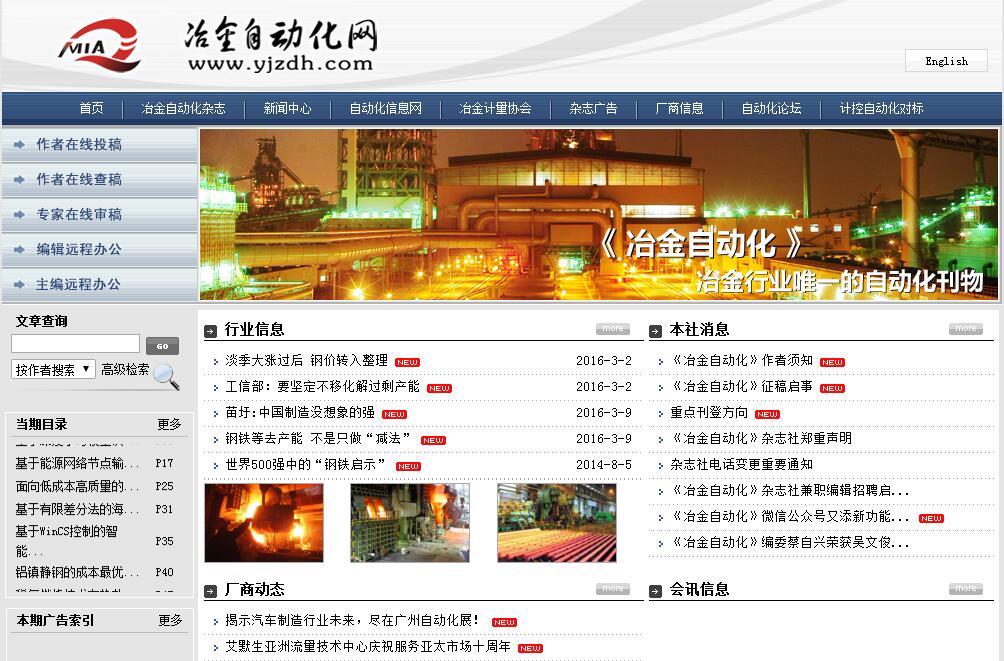《冶金自动化》是原国家科委批准、中国钢铁工业协会主管、冶金自动化研究设计院主办,冶金行业 (包括钢铁和有色金属)唯一国内外公开发行的自动化技术应用科技期刊,创刊于1976年,现为双月刊,国际通行版本(大16开本)。《冶金自动化》的读者对象是从事自动化科研、设计、生产、建设的广大科技工作者,中、高等院校专业师生及技术工人和管理人员。《冶金自动化》主要报道计量和检测技术、计算机应用及网络技术、电气传动自动化、自动控制理论在国内外冶金过程(包括钢铁和有色金属)控制与科学管理中应用的新发展(如专家系统、模糊控制、神经网络等)、新成果和新经验,并介绍国内外冶金自动化的新技术和新动态。设有专家论坛、综述与评论、前沿技术、人工智能技术应用、控制理论应用、检测与仪表、传动与控制等栏目。《冶金自动化》杂志社社长是夏宁女士、主编是沈黎颖女士,杂志社编委由中国工程院院士殷瑞钰先生、刘玠先生、柴天佑先生、王国栋先生,联合国专家、纽约科学院院士、国际导航与控制科学院院士蔡自兴先生,美籍教授吕勇哉先生等57位专家组成。《冶金自动化》审查稿件程序严格,拥有一批高等院校、科研院所、国有大型企业的专家长期为杂志审查稿件,为稿件质量把关。《冶金自动化》在国内自动化领域已成为一种有较大影响、学术水平较高的技术期刊,同时在国际上亦有一定的影响和知名度。本刊是中文核心期刊,中国科技核心期刊,中国学术期刊(光盘版)入编期刊,英国《科学文摘》INSPEC、俄罗斯《文摘杂志》(AJ)、美国《剑桥科学文摘》(CSA)、波兰《哥白尼索引》(CI)数据库收录期刊等。自1986年以来,连续(两年一届)被评为冶金行业优秀科技期刊,先后荣获全国优秀科技期刊二等奖(1997年),冶金科技期刊一等奖(1996~1997年度、1998~1999年度、2001~2002年度),中国科技期刊方阵双百期刊(2001年),第二届、第三届国家期刊奖百种重点期刊(2003年,2005年)。自1990年以来连续被评为北京市重信誉、创优质服务先进单位及首都广告行业精神文明先进单位(1990年,1993年,1997年,1999年,2001年,2003年,2005年)及全国争创广告行业精神文明表扬单位(1998~1999年度), 2005年中央企业“巾帼文明岗”,2008年“全国三八红旗集体”。