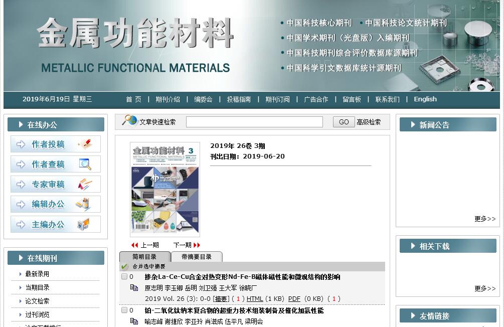 | 网站简介: 《金属功能材料》是由中国钢铁工业协会主管,中国钢研科技集团有限公司、中国金属学会功能材料分会、北京钢研柏苑出版有限责任公司主办的科技期刊(CN11-3521/TG;ISSN 1005-8192),是中国金属功能材料研究与开发领域很有影响力的技术性刊物之一。《金属功能材料》现任主编为钢铁研究总院副院长、中国金属学会功能材料分会秘书长赵栋梁教授。《金属功能材料》现为中国科技核心期刊。自1994年创刊以来,已成为中国科技论文统计源期刊、中国学术期刊综合评价数据库来源期刊、中国科学引文数据统计源期刊、中国学术期刊(光盘版)入编期刊及中文电子期刊服务资料库收录期刊。 |