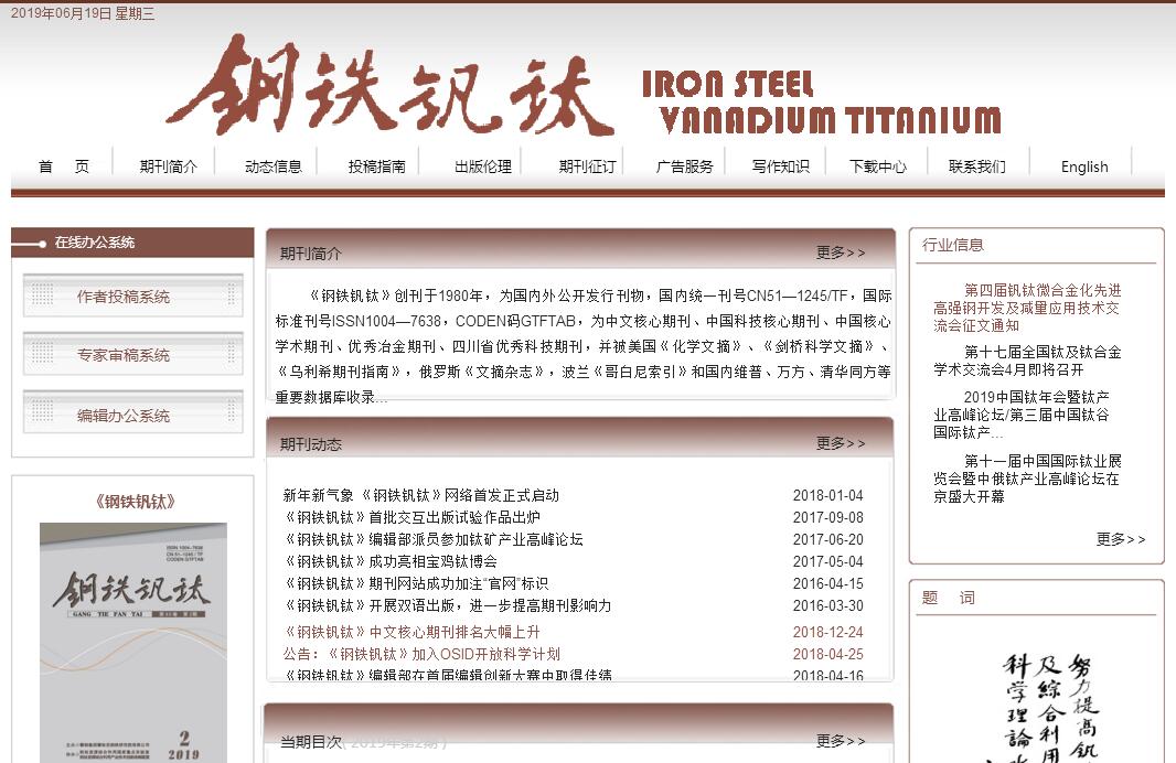 《钢铁钒钛》创刊于1980年,为国内外公开发行刊物,国内统一刊号CN51—1245/TF,国际标准刊号ISSN1004—7638,CODEN码GTFTAB,为中文核心期刊、中国科技核心期刊、中国核心学术期刊、优秀冶金期刊、四川省优秀科技期刊,并被美国《化学文摘》、《剑桥科学文摘》、《乌利希期刊指南》,俄罗斯《文摘杂志》,波兰《哥白尼索引》和国内维普、万方、清华同方等重要数据库收录。《钢铁钒钛》原为季刊,2012年起改为双月刊,由攀钢集团攀枝花钢铁研究院有限公司主办,钒钛资源综合利用国家重点实验室、钒钛资源综合利用产业技术创新战略联盟、国际钒技术委员会等协办,是一本综合性冶金科技期刊,也是目前国内唯一系统报道钒钛磁铁矿冶炼及其综合利用的学术性刊物。原国务院副总理﹑中国科学院院长方毅亲笔题写刊名,并题词“努力提高钒钛磁铁矿冶炼及综合利用的工艺技术和科学理论水平”。创刊以来,《钢铁钒钛》始终坚持以钒钛磁铁矿的开发、钒钛在钢中的应用以及钒钛资源综合利用为主题的办刊宗旨,优选报道了普通高炉冶炼钒钛磁铁矿技术、钒钛磁铁矿高炉冶炼系列强化技术、雾化提钒、转炉提钒、半钢炼钢及连铸技术、钒微合金化技术及系列钢种开发、含钒钢轨及钢轨全长淬火热处理技术、钒渣制取五氧化二钒、钛白生产及产品深加工等一大批重大选题,全面地反映了钒钛磁铁矿冶炼和钒钛资源开发利用的进展情况,同时也记载了攀钢在建设、生产中具有特色的实践经验,在传递钢铁钒钛行业信息、推广优秀科研成果、指导科研生产、推动钒钛行业技术进步、发现培养优秀科研人才等方面都起到了重要作用。《钢铁钒钛》拥有一个具有较高水平的编委会和一支稳定的由专家学者组成的审稿队伍;编辑人员多来自科研一线,均通过新闻出版总署编辑岗位培训,具有丰富的科研、生产经验,对本专业的科技论文具有独立的判断能力;严格按出版标准进行期刊的编辑、加工,禀承客观严谨、执著求索的学术精神,始终致力于技术性、创新性、知识性、可读性的结合,保证了期刊的学术水平和编辑质量。2012年改版后,刊物栏目得到进一步凝练和优化,共分为钒钛提取、钒钛应用、资源与环境、综述、冶金工艺、金属材料等版块,使钒钛主题更加鲜明,大大强化了刊物的信息整合和资讯服务功能。展望未来,任重道远,《钢铁钒钛》决不辜负广大读者、作者的厚爱,定当策马扬鞭,以更开阔的视野、更敏锐的眼光,捕捉钢铁钒钛领域的点滴进步,努力追求学术质量与编辑质量的完美融合,努力把《钢铁钒钛》办成特色突出的精品科技期刊,成为国内外钒钛研究领域成果发布、学术研讨的重要载体和交流平台,服务于从事钒钛磁铁矿资源开发利用的广大科技工作者。
