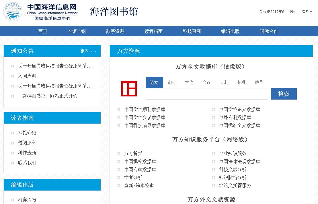 国家海洋信息中心海洋图书馆(文献馆)自1964年建馆以来,一直专注于海洋专业书刊文献资源建设,成为国内一个具有代表性的综合性海洋科学专业图书馆,馆藏中外文海洋专业文献资料较为丰富。目前馆藏资源包括:中文图书一万三千余册,西文图书一万四千余册,日文图书两千四百多册,俄文图书四千八百多册,西文特种文献两万三千余册,标准近五百份,版本一千余册,期刊合订本数量超过四万五千册,一千八百余件馆藏图件。本馆自 1984 年就开始进行海洋文献数据库建设,通过自建和引进相结合的方法建立起一个初具规模、实用性较强的中外文海洋文献检索系统,该馆 1986 年引进的《水科学和渔业文摘》是国内第一张数据库光盘。国家海洋信息中心海洋图书馆为推进海洋数字图书馆建设,打造海洋文献资源采集、加工和共享服务平台,集成商用文献资源、自建特色数字文献资源和开放资源,打造局内最权威的海洋数字文献服务平台,订制了万方中文数据库、馆藏外文期刊全文数据库、维普中文期刊全文数据库、数字图书等电子资源,利用网络为国家海洋局局系统各单位提供全面快捷的文献共享服务。海洋图书馆积极加强国内国际海洋文献合作,实现资源共享。在国内,该馆在上世纪 90 年代牵头成立了全国海洋文献信息协调委员会。在国际上,该馆具体履行联合国水科学和渔业情报系统( ASFIS )中国国家中心的职责与义务,是联合国政府间海洋委员会( IOC )出版物中国保管与服务中心,是国际海洋科学图书馆和情报中心协会( IAMSLIC )的正式成员。海洋图书馆在海洋文献信息服务方面具有较强的实力。 1997 年,国家海洋信息中心被原国家科委正式批准为国家一级科技查新单位,面向全国提供海洋和环境领域的科技查新服务。海洋图书馆负责《海洋通报》、《Marine Science Bulletin》、《海洋信息》等出版物的编辑出版工作。海洋图书馆是广大读者获取海洋科技文献信息的重要场所。我馆历来具有良好的服务传统,全体馆员正积极努力,争取多方支持,开发、利用和扩大海洋文献信息资源,加快海洋数字图书馆建设进程。热忱欢迎各位读者光临本馆或通过网络使用本馆的数字化资源。