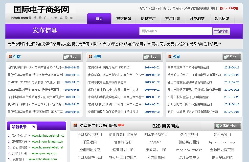 | 网站简介: 欢迎访问国际电子商务网,这里有各行各业信息网以及B2B电子商务网站,是最方便的免费网络推广平台,国际电子商务网已成为无数商家网络营销及网络推广的首选网站。 |