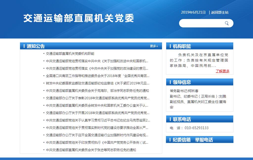 | 网站简介: 交通运输部直属机关党委主要职责:负责机关及在京直属单位党的工作;负责按有关规定管理国家铁路局、中国民用航空局、国家邮政局机关党的工作。 |
