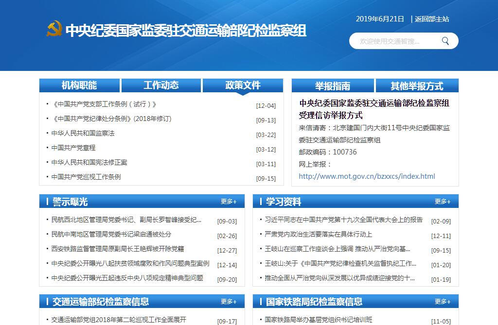 中央纪委国家监委驻交通运输部纪检监察组综合监督交通运输部、国家铁路局、中国民用航空局、国家邮政局(以下简称“驻在部门和综合监督单位”),依据党章和监察法规定,按照中央纪委国家监委授权,履行监督执纪问责和监督调查处置职责。主要职责如下:(一)督促驻在部门和综合监督单位领导班子落实全面从严治党的主体责任,履行对驻在部门和综合监督单位的监督责任。(二)检查驻在部门和综合监督单位领导班子及其成员遵守党章和其他党规党纪、执行党的路线方针政策决议、推进党风廉政建设和反腐败斗争等情况。(三)重点负责审查驻在部门和综合监督单位管理的领导班子及成员和司局级干部违犯党纪的案件;受理对驻在部门和综合监督单位党组织、党员的检举、控告,受理驻在部门和综合监督单位党组织、党员的申诉。(四)对驻在部门和综合监督单位各级领导班子履行全面从严治党主体责任不力、造成严重后果的,提出问责建议。(五)对驻在部门和综合监督单位公职人员开展廉政教育,对其依法履职、秉公用权、廉洁从政从业以及道德操守情况进行监督检查;对涉嫌贪污贿赂、滥用职权、玩忽职守、权力寻租、利益输送、徇私舞弊以及浪费国家资财等职务违法和职务犯罪进行调查;对违法的公职人员依法作出政务处分决定;对履行职责不力、失职失责的领导人员进行问责;对涉嫌职务犯罪的,将调查结果移送人民检察院依法审查、提起公诉;向监察对象所在单位提出监察建议。(六)承办中央纪委国家监委交办的其他事项,协助驻在部门和综合监督单位做好巡视工作。