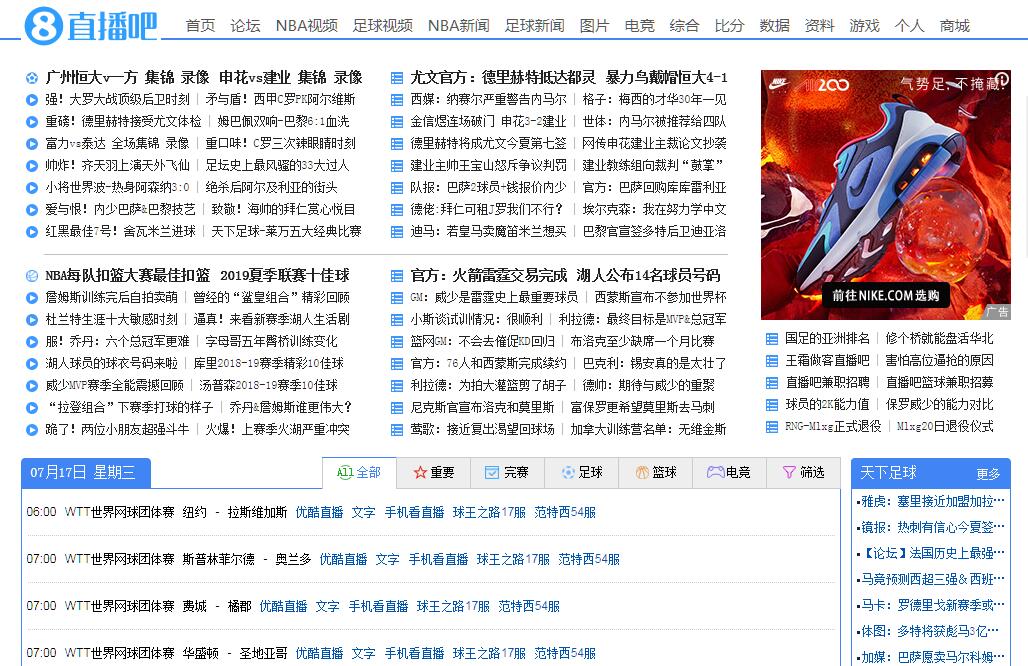 | 网站简介: 直播吧是知名体育平台,主要为足球迷,篮球迷等提供直播,新闻资讯,数据,论坛社区,原创报道,视频集锦等服务。 |