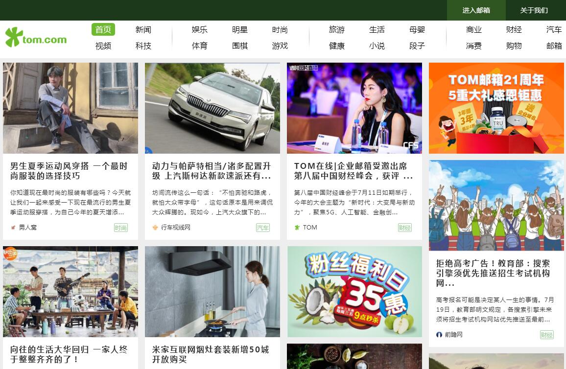 | 网站简介: TOM网(www.tom.com)是一款轻奢即时资讯平台,它为用户推荐最新的娱乐资讯、时尚前瞻的搭配指南,是国内了解娱乐、时尚资讯最便捷的途径之一,内容涵盖娱乐时尚、体坛赛事、要闻事件、汽车科技、母婴消费、购物生活、健康旅游、游戏邮箱、段子的频道信息。 |