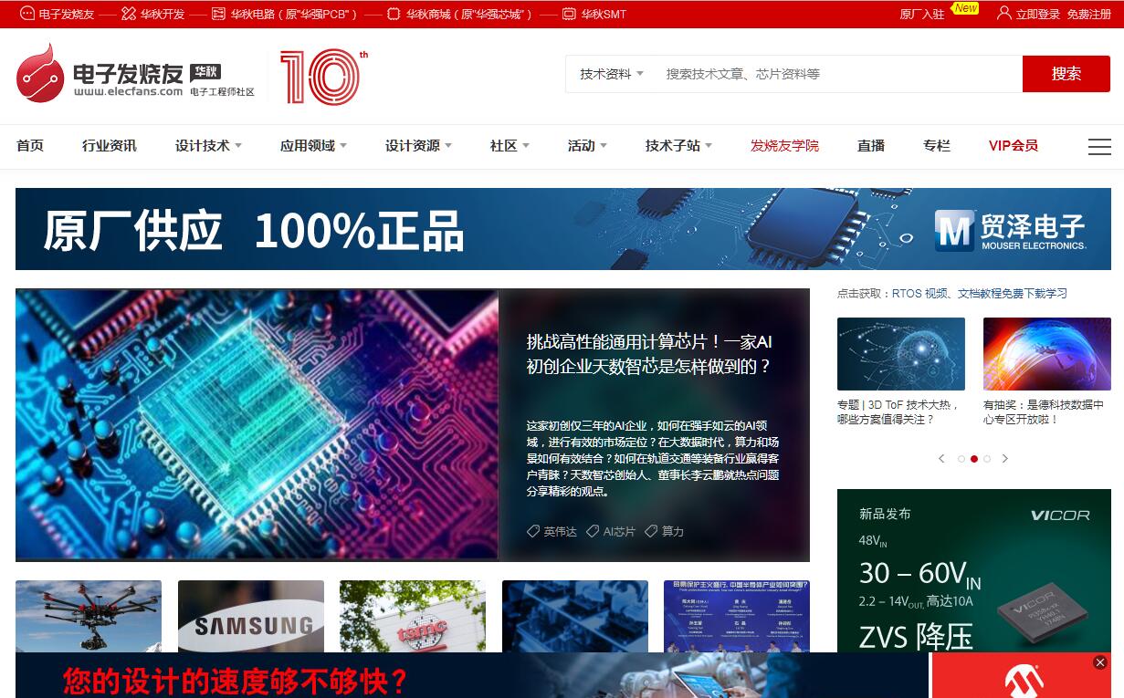 | 网站简介: 深圳华秋电子有限公司(原“深圳华强聚丰电子科技有限公司”)成立于2011年,旗下有电子发烧友、华秋开发、华秋电路、华秋商城(原华秋芯城)、华秋SMT等业务模块。为电子企业提供行业资讯、方案开发、PCB制造、元器件采购SMT贴片等一站式服务。电子发烧友(www.elecfans.com)成立于2009年,是专业的电子行业门户网站,提供电子行业新动态和产品信息,分享电子工程师设计经验及技术应用,构建电子行业专业的互动交流、学习探讨、经验分享平台。电子发烧友网开办的栏目主要有电子资料、技术应用、元器件、电路图、电子论坛等。电子发烧友专注于单片机、嵌入式技术、消费电子、半导体技术、EDA技术等领域。电子发烧友涉及的技术涵盖电源技术、模拟数字、嵌入式、单片机、DSP、AMR、通信网络、无线通信、传感控制、监视及光电、EDA/PLD、汽车电子、医疗电子、3G手机、存储器、音视频、电子制造、半导体技术。电子发烧友网凭借海量优质的信息资源、先进的行业社区论坛、活跃的网友互动氛围,受到业内人士的喜爱和追捧,已成为中国电子行业中人气较高的网络媒体,并和许多国内外电子企业建立了合作关系。 |