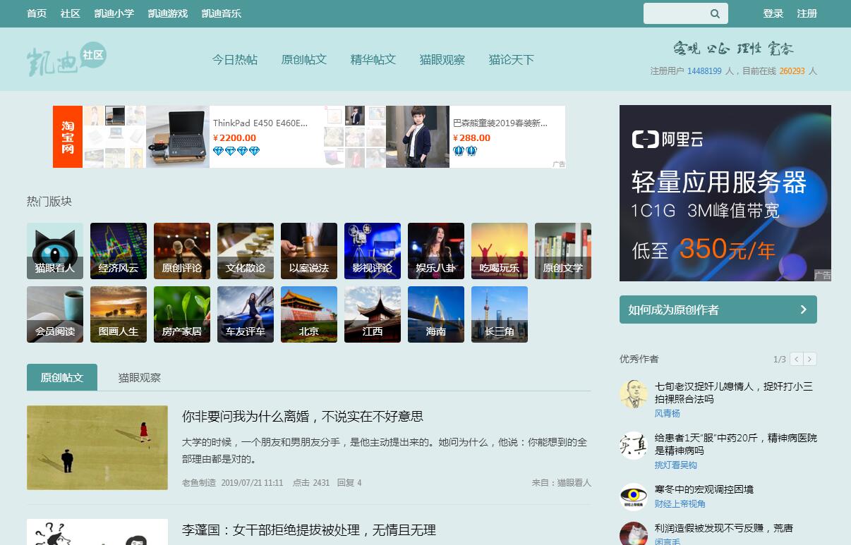 凯迪网络(www.kdnet.net)于1999年创立、2000 年6 月1日在海南省海口市正式上线,发端之初使用www.cat898.com域名运行至2012年,之后使用现域名至今。凯迪网络伴随着中文互联网与中国网民共同成长,从我国第一代网络论坛发轫,以“客观、公正、理性、宽容”为办网宗旨,聚集近1500万中外注册用户,其中多半为中心城市中高端用户,集结着一大批市场活跃引领群体。凯迪网络已发展成为汉语使用区最具代表性的互联网UGC (用户生成内容)平台之一,其中“猫眼看人”连续多年在全国所有社区论坛版块中排名第一;经济风云与文化散论等已成众多读者喜爱的品牌栏目。目前,凯迪网络拥有60个内容版块(频道、论坛、重点栏目),流量集中在时事政治、财经、法制、生活服务、文艺原创等区域。即将开通的《度假生活》与《美食家》将为凯迪网络的线下发展鸣锣开道。20年来,凯迪网络的关注视角从未在国际、国内任何重大事件中缺位,通常都处于信息最前沿。凯迪网络坚定捍卫党的十一届三中全会以来中国改革开放成果。在重大的舆论监督场合,凯迪网络始终坚持 “建设者”的立场,在信息最前沿成为最具代表性的民意表达平台。本站拥有网络虚拟世界的“世界最高楼”记录——单个主帖的点击浏览量超过4亿,跟帖盖楼超过120万层,成为互联网发展史上罕见奇迹。这里每天超过百万用户在这个超人气社区或是畅所欲言、或是深入围观,每一种理性声音都能在这里找到共鸣,每一种生活经验都有观众分享,凯迪网络作为中文论坛“深水区”名副其实。除了传统BBS模式的公共议事型的社区广场,凯迪网络在自媒体涌动的背景下推出更便捷的信息精致化服务,以解决用户在移动互联网时代被碎片化信息干扰、因网络喧嚣而迷茫的困境,充分满足群体间高品质沟通和价值信息获取。在优化及提升产品的社交沟通能力与用户沟通方式的同时,为以内容传播驱动的媒体业务提供互动营销平台。作为一座超人气互动广场,为满足广大信息消费者同时存在的生活需求,凯迪网络适时推出诸如《度假生活》《美食家》《健康社会》《车友评车》《阅读与思考》(中间地带)等频道(栏目)。它们以鲜活的内容、独特的视角、犀利的评价成为读者线下的优质生活指南。“观乎天文以察时变,观乎人文以化成天下”,在互联网发展进入新时代的今天,凯迪网络与时俱进,明确实施全新战略方向:专注文化、财经、生活服务和社会领域,探索知识经济及信息产品的多样性,为互联网新生代提供价值信息,以优质信息传承人文,以积极向上、客观理性立场传播社会价值。
