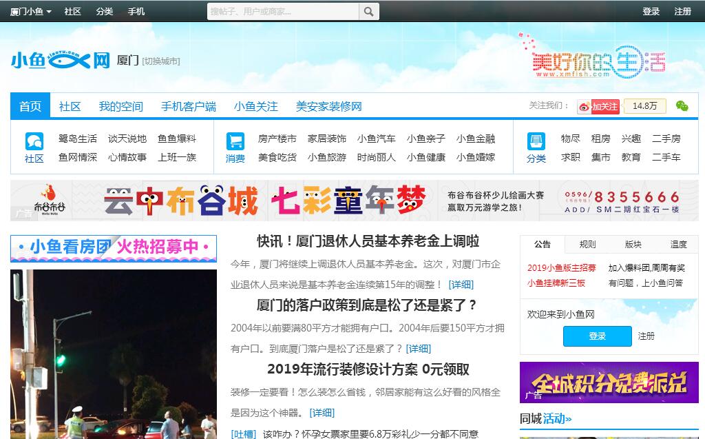福建小鱼网络科技股份有限公司旗下小鱼网创办于2003年,经过十余年发展,已成为具有全国知名度和影响力的生活消费门户网站之一,业务版块覆盖房产、家居、汽车、婚庆、餐饮、旅游、教育、健康、医美、金融等十几个领域。小鱼网站点覆盖厦门、福州、漳州、泉州、晋江,现拥有注册会员超过500万,手机客户端装机量超120万,新媒体矩阵粉丝数超110万。在第四、五届中国互联网站长年会上,厦门小鱼网众望所归,连续被评为"2009中国影响力地方性互动网站二十强"、"2010中国影响力的地方性互动网站二十强"、"2010年阿里巴巴颁发行业先锋奖"。根据ALEXA全球网站排名数据显示,小鱼网全球流量排名6541,全国排名614,社区论坛影响力统计来看,小鱼网位居全国排名第九。信息的传播速度和影响力已经远远超过传统媒体。2016年小鱼网正式挂牌新三板,证券代码837299,简称为"小鱼股份"。2017年小鱼股份更是凭借优秀的业绩,跻身新三板创新层。小鱼网始终致力于以互联网社区为基础,基于用户城市生活数据的沉淀,建立移动互联网大数据技术应用的城市生产和生活社区公共服务平台,以此为商户提供互联网综合营销解决方案,为商户和用户间建立从品牌认知、决策、交流、搜索、购买到评价的营销闭环服务。未来,小鱼网还将立足于海西本地城市生活消费门户,以打造一个有温度的生活社区和城市生活消费电商为发展目标,逐步辐射全国。