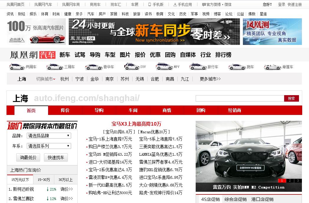 | 网站简介: 凤凰网汽车网站为您提供最及时的汽车报价、汽车降价、汽车导购、新闻、行情及汽车经销商信息,以及本地的汽车相关服务,是您选车买车用车的首选网站。 |