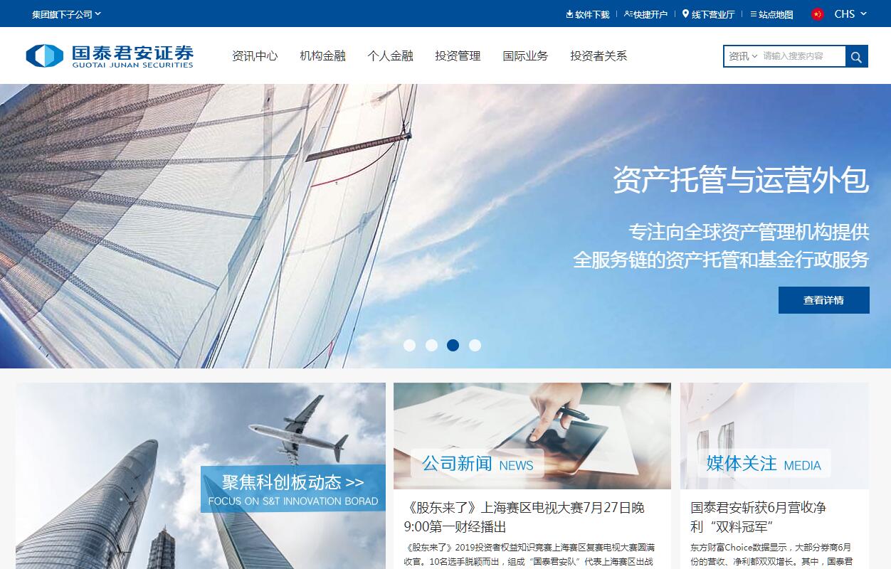 国泰君安证券股份有限公司由原“国泰证券”和原“君安证券”于1999年8月18日合并设立,是中国证券行业里长期、持续、全面领先的综合金融服务商。国泰君安跨越了中国资本市场发展的全部历程和多个周期,始终以客户为中心,深耕中国市场,为个人和机构客户提供各类金融服务,确立了全方位的行业领先地位。目前,国泰君安在全国设有30家分公司以及300余家证券营业部,在北京、上海、深圳、杭州等多地设立多家财富管理中心,是国内规模最大、经营范围最广、机构分布最广、服务客户最多的证券公司之一。2011到2017年,国泰君安的营业收入连续七年名列行业前三,在致力于实现高质量增长、规模领先的同时,注重盈利能力和风险管理。自2008年以来,国泰君安连续十一年获得中国证监会授予的A类AA级监管评级,该评级是迄今为止中国证券公司获得的最高评级。国泰君安始终坚持“以人为本、协同协作”的人才观,建立了科学完善的聘用、薪酬、考核、晋升机制;重视人才队伍培养,倾力于打造完善的培训体系,为每一位员工在其服务期间提供持续的再学习机会;构建了多层次的福利保障体系,关心并帮助员工成长,形成了企业和员工共同发展的和谐环境。2015年6月26日,国泰君安在上海证券交易所成功上市,股票代码601211;2017年4月11日,国泰君安在香港联合交易所主板正式挂牌交易,股票代码为2611.HK。基于在中国本土强大的竞争优势,未来国泰君安将主动满足客户跨境需求,务实推进国际化,建立覆盖全球的业务网络和执行能力,为客户提供综合金融服务,努力成为根植本土、覆盖全球、有重要影响力的综合金融服务商。