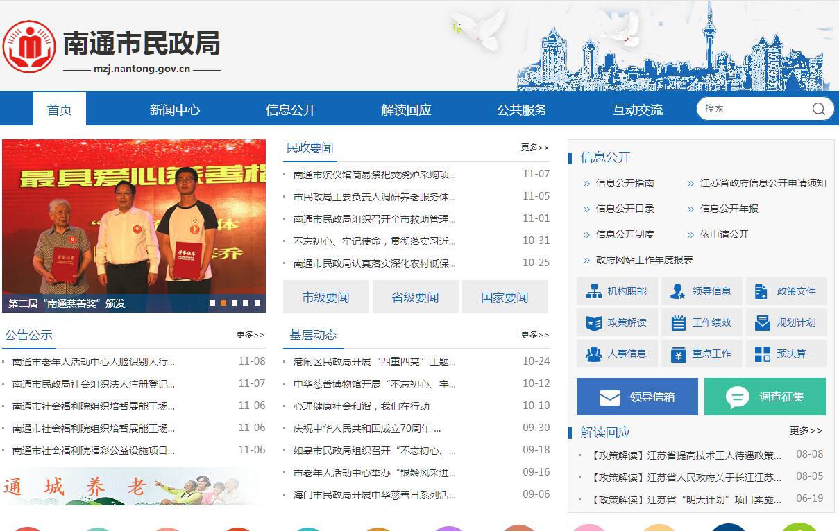 南通市民政局,为市政府工作部门。其主要职责是:(一)贯彻执行国家、省有关民政工作的方针政策和法律法规。拟订全市民政事业中、长期发展规划,起草全市民政工作的政策和有关规范性文件,并组织实施和监督检查,指导全市民政工作的改革和发展。(二)拟订全市社会组织管理办法,起草有关规范性文件草案,依法承担对社会组织的登记管理和执法监察责任。(三)拟订全市优抚政策、标准和办法,承担由民政部门管理的伤残人员伤残抚恤管理工作,承担追认革命烈士的审核报批和革命烈士褒扬工作。组织指导拥军优属工作,承担市拥军优属拥政爱民工作领导小组的日常工作。(四)负责转业士官、复员干部及移交地方安置的军队离退休干部和军队无军籍退休退职职工的接收安置工作,组织指导军供站、军人接待转运站和移交地方安置的军队离退休干部休养所(服务中心)的服务管理工作,组织指导退役士兵职业技能培训工作。(五)拟订全市救灾工作政策,负责组织、协调救灾工作,组织自然灾害救助应急体系建设,负责组织核查并统一发布灾情,管理、分配救灾款物并监督使用,组织指导救灾捐赠,承担市减灾委员会的日常工作。(六)拟订全市社会救助规划、政策和标准,统筹城乡居民最低生活保障、医疗救助、临时救助和无固定收入的重度残疾人生活救助工作,指导五保户社会救济工作,组织实施低收入家庭认定工作,承担市社会救助工作领导小组的日常工作。(七)拟订全市行政区划总体规划、地名管理办法,负责乡镇以上行政区域的设立、撤销、调整、更名和界线变更及政府驻地迁移的审核申报工作,负责管理地名档案和地名信息系统,组织开展地名公共服务。(八)拟订全市城乡基层群众自治组织建设和社区建设政策,指导、协调城乡社区服务体系建设,提出和改进城乡基层政权建设的建议,推动基层民主政治建设。(九)拟订全市社会福利事业发展规划、社会福利机构管理办法和社会福利企业扶持政策;负责本行政区域内慈善事业的发展和监督管理工作,组织开展社会捐助工作,指导老年人、孤儿、残疾人等特殊群体权益保障工作。(十)拟订全市婚姻、殡葬、收养、救助管理和城市生活无着落的流浪乞讨人员救助工作政策并组织实施,推进婚俗和殡葬改革,指导婚姻、殡葬、收养、救助服务机构管理工作。(十一)负责落实福利管理的政策规定,组织指导全市福利发行管理工作,管理市级福利公益金。(十二)会同市有关部门按规定拟订社会工作发展规划、政策和职业规范,推进社会工作人才队伍建设和相关志愿者队伍建设。(十三)贯彻执行有关老龄工作法律、法规,拟订全市老龄工作发展的政策并协助组织实施,承担与市老龄工作委员会各成员单位的联系、协调工作。(十四)承办市政府交办的其他事项。