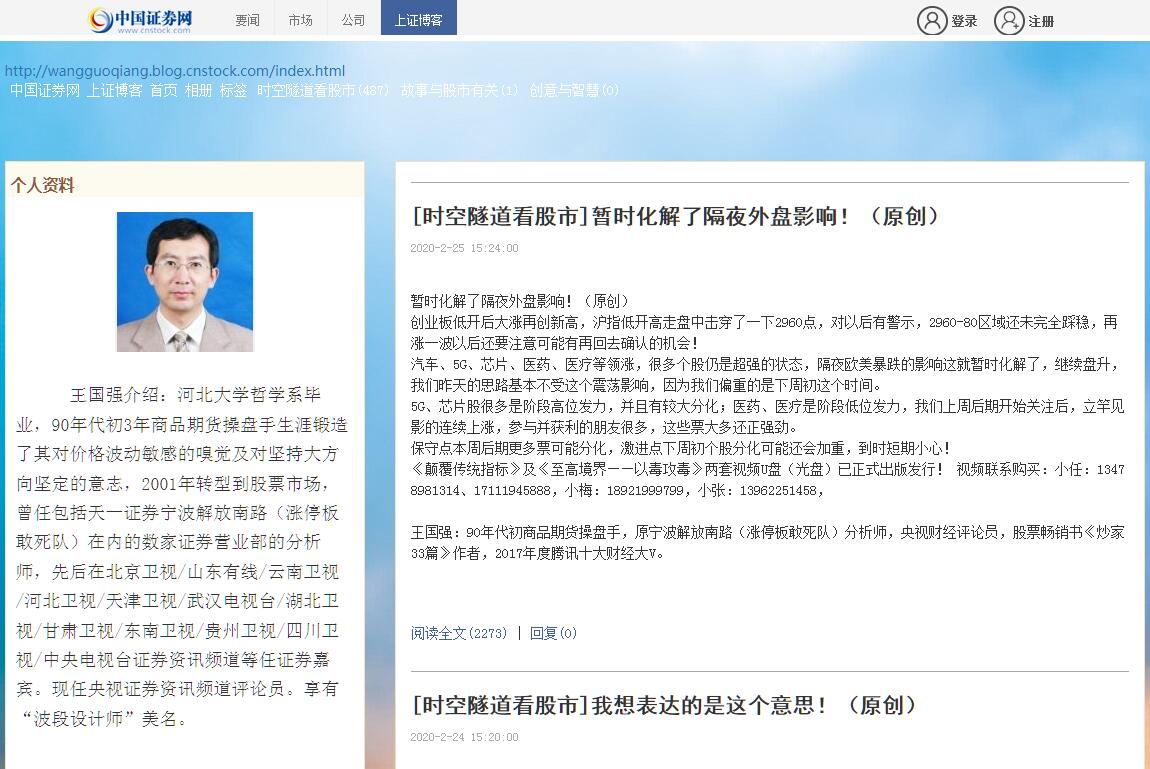 | 网站简介: 王国强介绍:河北大学哲学系毕业,90年代初3年商品期货操盘手生涯锻造了其对价格波动敏感的嗅觉及对坚持大方向坚定的意志,2001年转型到股票市场,曾任包括天一证券宁波解放南路在内的数家证券营业部的分析师,先后在北京卫视/山东有线/云南卫视/河北卫视/天津卫视/武汉电视台/湖北卫视/甘肃卫视/东南卫视/贵州卫视/四川卫视/中央电视台证券资讯频道等任证券嘉宾。现任央视证券资讯频道评论员。享有“波段设计师”美名。 |