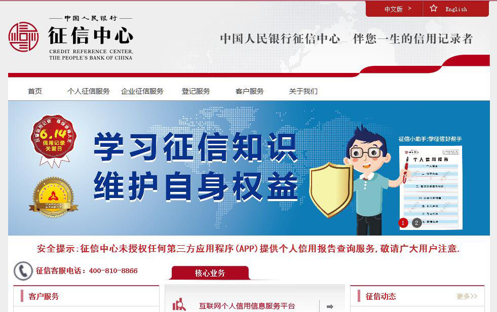 2006年3月,经中编办批准,中国人民银行设立中国人民银行征信中心,作为直属事业单位专门负责企业和个人征信系统(即金融信用信息基础数据库,又称企业和个人信用信息基础数据库)的建设、运行和维护。同时为落实《物权法》关于应收账款质押登记职责规定,征信中心于2007年10月1日建成应收账款质押登记系统并对外提供服务。2008年5月,征信中心正式在上海举行了挂牌仪式,注册地为上海市浦东新区。2013年3月15日施行的《征信业管理条例》(简称《条例》),明确了征信系统是由国家设立的金融信用信息基础数据库定位。目前,征信中心在全国31个省和5个计划单列市设有征信分中心。作为专业化征信机构,征信中心依法履职,积极推进征信系统建设,保障系统安全稳定运行,加快系统升级优化,深入推进服务转型,加强产品研发与应用,切实维护信息主体合法权益,充分发挥征信系统作为我国重要金融基础设施作用,为推动社会信用体系建设做出了积极的贡献。建成全球规模最大的征信系统。1997年,人民银行开始筹建银行信贷登记咨询系统(企业征信系统的前身)。自2004年至2006年,人民银行组织金融机构建成全国集中统一的企业和个人征信系统。今天的征信系统,已经建设成为世界规模最大、收录人数最多、收集信息全面、覆盖范围和使用广泛的信用信息基础数据库,基本上为国内每一个有信用活动的企业和个人建立了信用档案。截至2015年4月底,征信系统收录自然人8.6亿多,收录企业及其他组织近2068万户。征信系统全面收集企业和个人的信息。其中,以银行信贷信息为核心,还包括社保、公积金、环保、欠税、民事裁决与执行等公共信息。接入了商业银行、农村信用社、信托公司、财务公司、汽车金融公司、小额贷款公司等各类放贷机构;征信系统的信息查询端口遍布全国各地的金融机构网点,信用信息服务网络覆盖全国。形成了以企业和个人信用报告为核心的征信产品体系,征信中心出具的信用报告已经成为国内企业和个人的“经济身份证”。征信系统应用广泛、成效显著。征信系统已经在金融机构信用风险管理中广泛应用,有效解决了信息不对称问题,提高了社会公众融资的便利性,创造了更多的融资机会,促进了信贷市场发展。征信系统的广泛应用,显著提高了社会信用意识,在全社会形成“守信激励、失信惩戒”的激励约束机制。今后,征信中心将继续深化服务转型,全面提升可持续发展的能力和水平,把征信系统建设好,努力为全社会提供更加优质高效的征信产品和服务,继续为我国金融体系稳定、社会信用环境改善发挥作用。