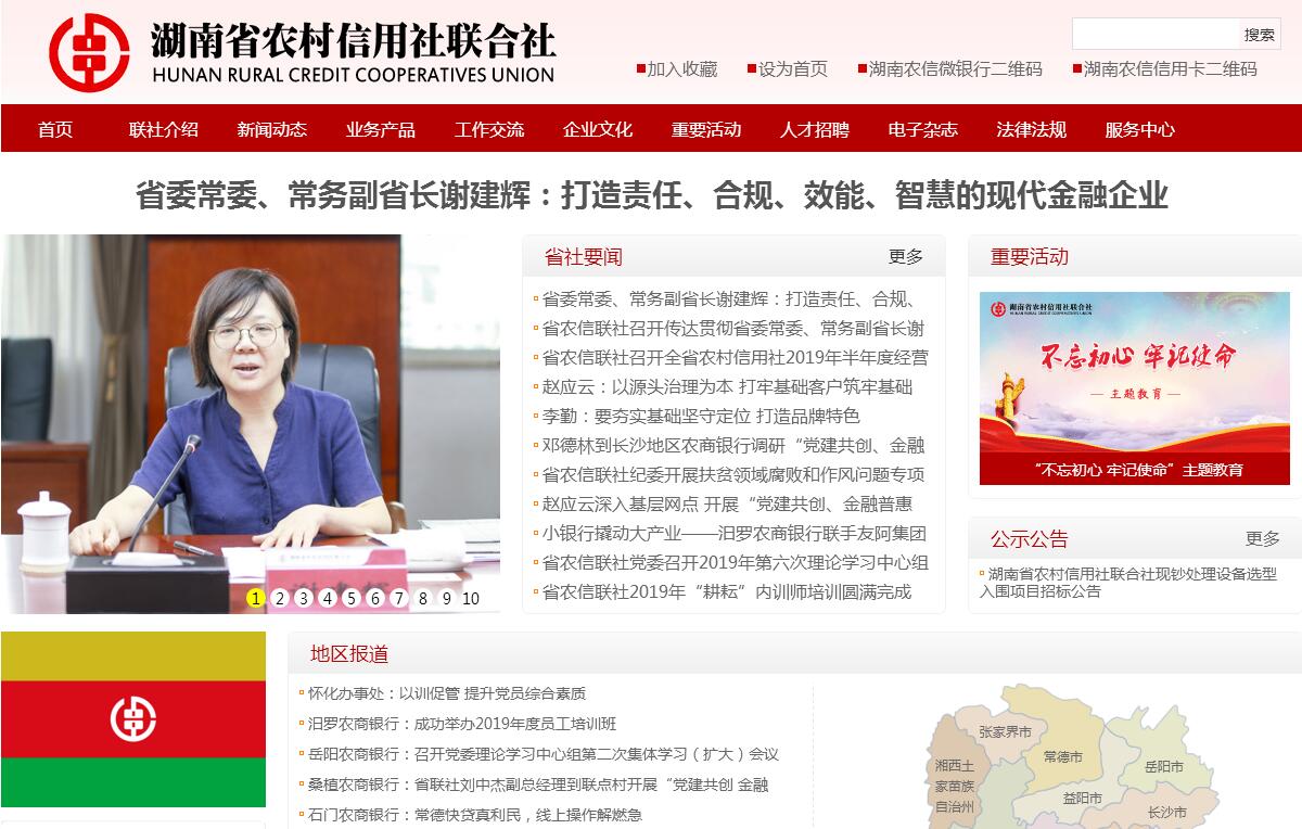 湖南省农村信用社联合社最早建立于1951年,先后经历过农业银行、人民银行和银监会管理。2003年,国务院启动了新一轮深化农村信用社改革试点工作。2004年8月,湖南被列入改革试点范围,全省农村信用社正式启动了进一步深化改革工作。2005年5月,经省委、省政府和中国银监会批准,湖南省农村信用社联合社正式成立,对全省农村信用社履行管理、指导、协调、服务职能,并在党的工作上实行垂直领导和统一管理。近年来,全省农村信用社以习近平新时代中国特色社会主义思想为指导,深入贯彻落实省委、省政府决策部署,坚持稳中求进工作总基调,坚持以提高质量和效益为中心,深化改革、强化管理、稳健经营、转型发展,开拓了全系统改革发展新局面。全省共1家省级联社、13家办事处、1家审计中心、102家农商银行。全系统在职员工约4万人机构网点4062个,其中3280个网点分布在乡镇和社区,实现乡镇全覆盖,是全省机构网点最多、从业人员最多、服务对象最多、服务范围最广的地方性银行业金融机构。截至2018年末,全系统存款总量为9144亿元,贷款总量为5351亿元,存、贷款总量分别占全省同业的比例为18.66%和14.68%,均居全省金融机构第一位。全系统涉农贷款余额3898亿元,小微企业贷款余额2436亿元,支农支小主力军作用不断突出。大额存单、智能存款、超级网银、国际结算、福祥e支付、“常德快贷”等新产品新渠道相继推出,服务产品和方式日益丰富。洋湖数据中心成功投产,新一代业务系统稳定、高效运行,科技实力达到全国农信系统一流水平。
