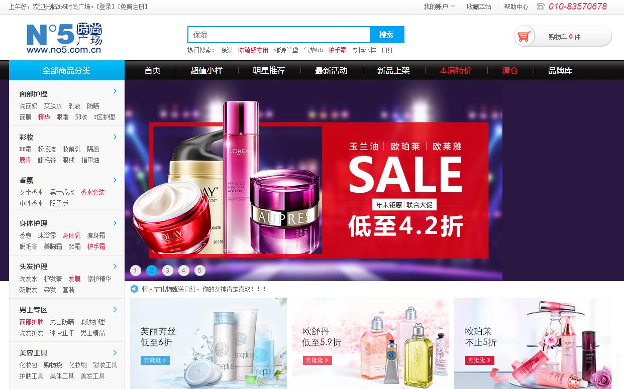 | 网站简介: N°5时尚广场(http://www.no5.com.cn)成立于2000年,隶属于北京思学普信息技术有限公司。公司主要经营护肤、香水、彩妆等女性用品的网上销售。设有规模化的运营和客服、物流中心,现经营品牌200多个,5000多种商品在线销售。我们一直以诚信经营为理念,以用户至上为宗旨,向消费者提供高品质的产品,方便、灵活的订购方式及支付系统,并已在全国开通1875个城市、直辖市的快递货到付款服务。成立以来,凭借优惠的价格及高效、优质的售后服务,销售额连年递增,赢得了广大消费者的信任与支持,在电子商务领域树立了品牌,并已处于领先地位。诚邀您加入N°5,享受尊贵的购物礼遇与丰富的优惠促销! |