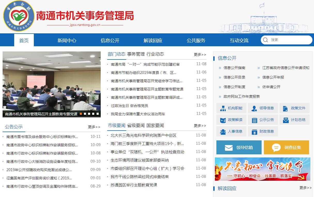 南通市机关事务管理局,为市政府工作部门。其主要职责是:(一)根据党和国家的有关方针、政策,研究拟定市级机关事务管理工作的具体政策、制度和办法,并组织实施。(二)负责制定市级行政机关财务、会计制度并监督执行。负责市级机关和民主党派机关等单位行政经费预决算、转拨以及预算外资金的管理。承担相关会计业务指导和财务制度审计监督等工作。(三)按规定负责市级机关房地产、办公设备、交通工具等国有资产的管理工作。(四)负责机关公务用车改革的政策制定和实施推进工作。负责市级机关公务用车的编制、配备、购置、挂牌、报废、更新经费的申报及车辆资料的管理等工作。(五)制定市级机关房地产管理规章制度并组织实施。配合相关部门做好市级机关办公用房的规划、投资、建设。负责市级机关办公用房的分配、调整、置换及维修项目的审核、申报等工作。(六)负责市级机关干部、职工住房制度改革工作,并按照房改精神和政策,审核、发放市级机关干部、职工住房补贴经费。(七)负责市行政中心和市民服务中心的办公秩序、物业管理、安全保卫和餐饮服务等后勤管理工作。(八)负责市级公共机构节能管理工作。负责推进、指导、协调、监督全市公共机构节能工作。(九)指导并组织实施市级机关以及县(市)区机关后勤干部岗位培训。会同有关部门具体实施市级机关后勤工人的技术培训工作,并配合做好等级考核工作。(十)会同有关部门研究拟订机关后勤企事业单位改革、改制的办法和措施,并监督实施。负责对市级机关以及县(市)区机关事务管理工作和深化机关后勤管理体制改革进行业务指导。(十一)承担市级重要会议、重大活动的服务工作。承办市委、市人大、市政府、市政协交办的其他事项。