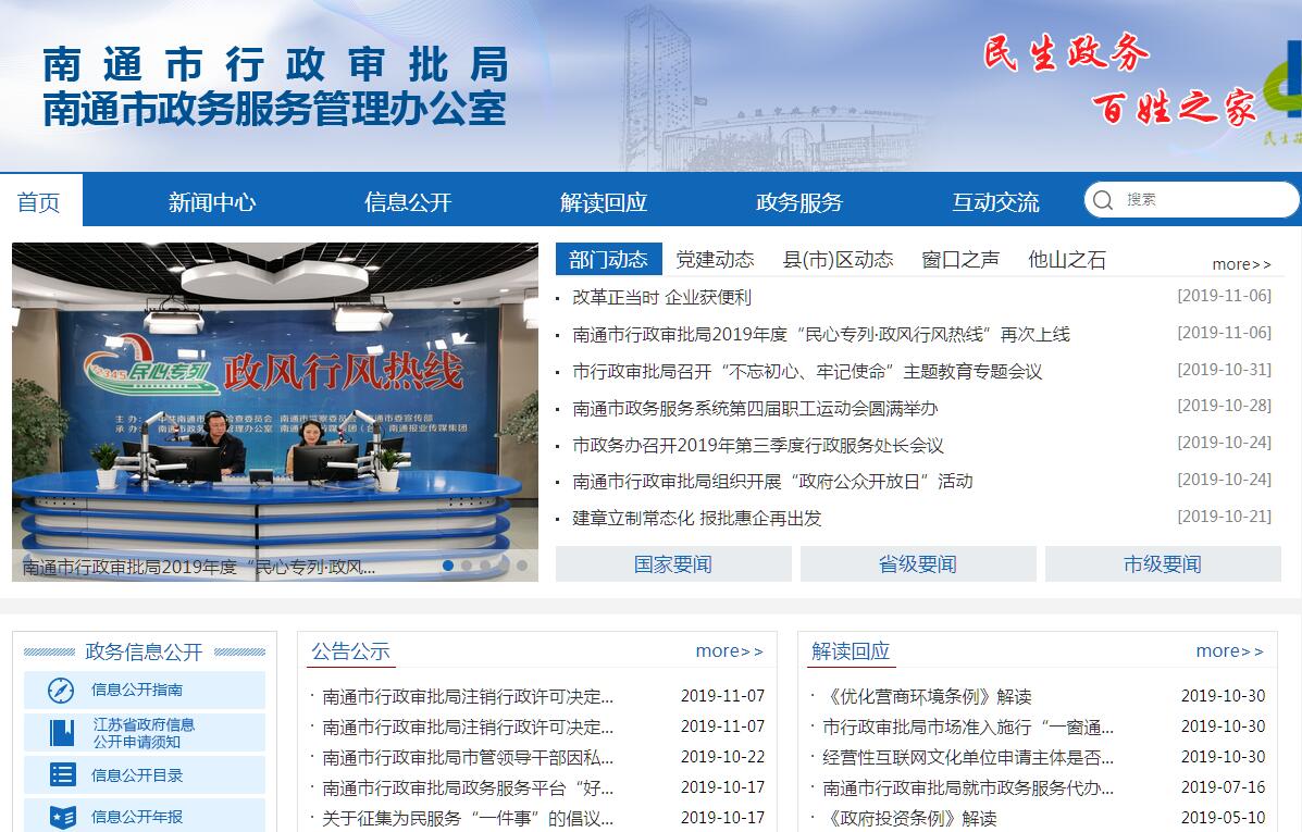 2015年4月,经国务院同意,中央编办、国务院法制办批准,南通在全国率先启动国家级相对集中行政许可权改革试点工作。2015年8月20日,在南通市政务中心的基础上,全国首家地级市行政审批局——南通市行政审批局正式挂牌成立,同时,市政务中心更名为市政务服务中心,与市行政审批局合署办公,加挂市公共资源交易管理办公室牌子,下辖市公共资源交易中心、市12345政府公共服务中心、市行政审批技术服务中心。南通市行政审批局(市政务服务中心)主要承担市级部门划转的行政审批事项的审批职责,并负责组织、协调、监督、考核、管理进驻单位依法、高效办理行政审批、公共服务、公共资源交易事项。南通市政务服务大厅共五层,建筑面积35000平方米,入驻部门单位59个,办事窗口366个,工作人员700多名,另设公安车管、房产、口岸、人民银行等分中心。市公共资源交易中心为主负责建设工程招投标、政府采购、土地招拍挂等12个交易事项。市12345政府公共服务中心整合65家市级部门和单位的78条服务热线,统一受理反馈社会公众诉求事项、办事结果。南通市行政审批局(市政务服务中心)是全省唯一获得“全国文明单位、省文明单位、省五一劳动奖状”的地级市政务服务机构,是国家级服务业标准化示范项目,群众满意度持续保持在99.5%以上。组织、协调、监督、管理进驻中心的部门(单位)办理行政许可、非许可行政审批和服务事项,对窗口工作人员进行管理培训和日常考核;统筹管理市级各类公共资源交易事项,现场监管交易活动,受理投诉并协调处理。