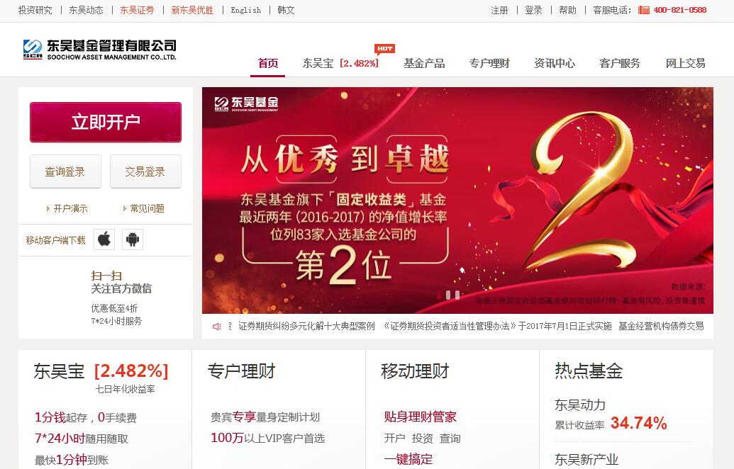 东吴基金管理有限公司是经中国证监会批准成立的全国性基金管理公司。公司成立于2004年9月,总部位于上海。注册资本1亿元人民币。公司股东为东吴证券股份有限公司(占70%股份)、海澜集团(占30%股份)。其中,东吴证券股份有限公司注册资本20亿元,并于2011年12月12日在上海证券交易所挂牌上市,主要从事证券代理买卖、证券自营买卖、证券承销和上市推荐、企业重组、收购与兼并、基金与资产管理等业务;海澜集团成立于1988年,是国内服装龙头企业。集团现有总资产500亿元。在2016年中国企业500强中名列166位、中国民营企业500强中名列31位。2016年,集团完成营业总收入933亿元、利税80亿元。公司经营范围包括基金管理业务、发起设立基金和经中国证监会批准的其他业务。自2005年发行第一支基金以来,公司逐渐形成了高中低风险结合的完善产品线,并走出了一条独具特色的新兴产业投资产品线,凸显了战略投资基于成长性公司的产品线优势。除了公募业务之外,公司还始终致力于业务多元化发展,公司专户资格已获批,机构理财、专户投资、QDII等新业务也已准备有序。依托新兴产业方面的先发优势和良好的投资业绩,公司先后荣获最具投资价值基金公司、最佳投资团队、中国证券报金牛进取奖、上海证券报金基金•股票投资回报公司奖、证券时报明星基金公司成长奖、证券日报金算盘奖、金基金·成长公司奖。由于业绩表现突出,公司多支基金产品也获得业界殊荣。东吴行业轮动获理财周刊“年度最佳表现股票型基金”;东吴双动力获中国证券报“股票型金牛基金”,东吴策略获中国证券报“混合型金牛基金”;东吴嘉禾获证券时报“积极混合型明星基金奖”,东吴双动力获证券时报“股票型明星基金奖”,东吴策略获证券时报“积极混合型明星基金奖”。东吴基金和中央电视台财经频道在上海联合举办的“新经济财富论坛”,已成为业内一年一度的饕餮盛宴,强化了东吴基金在新兴产业方面的权威形象。东吴基金拥有一支经验丰富而又充满活力的专业团队,平均年龄33岁,其中硕士以上学历占50%;具有5年以上基金、证券从业经历的占60%;公司高管和主要投资管理人员的平均金融从业年限为10年,具有丰富的实践操作经验和管理经验。作为传统吴文化与前沿经济理念的有机结合,东吴基金崇尚"以人为本,以市场为导向,以客户为中心,以价值创造为根本出发点"的经营理念;遵循“诚而有信、稳而又健、和而有铮、勤而又专、有容乃大”的企业格言;树立了“做价值的创造者、市场的创新者和行业的思想者”的远大理想,创造性地树立公司独特的文化体系,在众多基金管理公司中树立自己鲜明的企业形象。