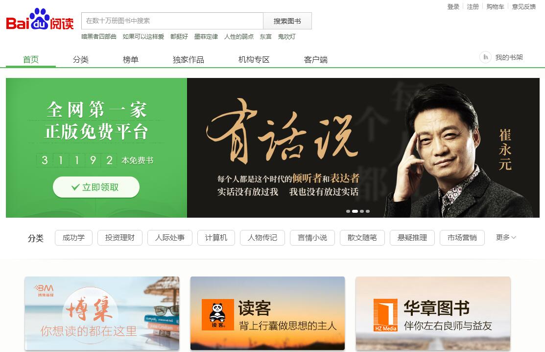 | 网站简介: 百度阅读提供丰富的电子图书、畅销书排行榜,种类包括小说、文学、传记、艺术、少儿、经济、管理、生活等电子书的网上销售,为您提供最佳的阅读体验。 |