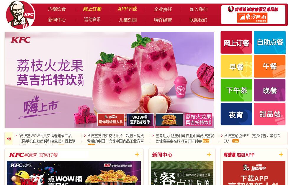 中国肯德基官方网站。肯德基KFC坚持“立足中国、融入生活”,打造新快餐,提供早餐,午餐,下午茶,晚餐,夜宵和甜品站等丰富选择。网上订餐,天天优惠。电子优惠券,打印即用。30年来,中国肯德基坚持“立足中国、融入生活”的策略,推行“营养均衡、健康生活”的食品健康政策,积极打造“美味安全、高质快捷;营养均衡、健康生活;立足中国、创新无限”的“新餐饮”。在产品多样化上不断创新,开发出更多适合中国人口味的食品。肯德基尤其注重新产品的开发,90年代中期就成立了自己的产品研发团队。1987年,在北京前门肯德基餐厅只能买到8种产品,现在到餐厅至少有56个常规产品的选择,其间累计新品上市超过478种。近几年,平均每年以推出40多种的新品速度服务着广大中国消费者。目前,除了广为消费者喜爱的吮指原味鸡、香辣鸡腿堡、香辣鸡翅等代表产品外,由中国团队研发的老北京鸡肉卷、新奥尔良烤翅、早餐花式粥、葡式蛋挞、安心油条、法风烧饼、醇豆浆等都受到好评和欢迎。2017 年起,肯德基对部分产品进行升级,其中包括倍受欢迎的冰淇淋将奶浆升级为全乳脂冰淇淋,浓醇柔滑,乳香浓郁,品质比升级前更上一层楼;经典产品薯条则每一根都裹上了360度黄金裹衣,表皮香脆,内里锁热,薯香浓郁。肯德基充分利用分布在全国1200多个城市和乡镇的5000多家餐厅,通过餐盘垫纸和宣传单页向广大消费者传递食品、卫生、营养、运动常识,引导人们建立正确的饮食、健康习惯。与此同时,还定期在餐厅组织儿童营养教育活动。2004年1月发布《中国肯德基食品健康政策白皮书》,表明了肯德基致力于倡导健康生活理念的决心和信心。并在此基础上,提出“天天运动,健康一生,让我们动起来”的口号,开展“体坛群英”、“肯德基全国青少年三人篮球冠军挑战赛”和“肯德基全国青少年校园青春健身操大赛”。2018年,肯德基所属的百胜中国在原白皮书基础上更新出版《百胜中国营养健康策略白皮书》,进一步阐明了百胜中国提倡平衡膳食和健康生活方式的营养健康理念。肯德基致力于支持餐饮营养健康科学研究。2007年11月,“中国肯德基餐饮健康基金”成立,该基金与中国红十字基金会共同设立,旨在促进平衡膳食和改善中国城市居民餐饮行为。在过去近10年里,该基金共资助项目50个,累计资助金额超过1500万元。2017年5月,在“健康中国”国家战略引领下,本着共同推动餐饮健康科研事业的愿景,肯德基所属的百胜中国与中国营养学会决定强强联合,在原基金基础上成立中国营养学会—百胜餐饮健康基金。努力打造一个符合中国国情的食品安全体系。2005年6月份百胜全球首席技术官裴华庆调任中国担任首席供应官;2005年7月初,首位食品安全官居乃琥先生正式到任; 2006年2月,成立“食品安全专家咨询委员会”;2008年3月,发布《百胜中国食品安全政策白皮书》,与此同时还强化了供应商管理系统。2013年6月起,田明福担任食品安全官;同年7月25日,“中国百胜餐饮集团特约食品安全实验室”在上海正式挂牌;2015年1月,陈玟瑞担任首席供应官。另外,中国百胜还建立和管理着自己的物流网络,在全国现有17个物流中心和2个整合中心,是确保食品安全的重要环节。2015年,肯德基进入数字化创新时代,积极拥抱互联网,从官网、微博、到微信,全方位构建线上平台,为消费者使用提供更多便捷;同时以科技武装餐厅,积极推进餐厅的数字化服务—— WIFI、电子餐牌、扫码付款、虚拟礼品卡等,为消费者提供更丰富便捷的用餐体验。2016年,肯德基在人工智能及数字化体验上的探索引领时代潮流。肯德基精准地捕捉到作为移动终端的代表——手机将在未来的生活场景中发挥的作用。为此,肯德基聚焦手机,从手机支付、手机自助点餐、会员服务三个维度将传统的用餐场景与手机渠道一一对接,将餐厅装入消费者的手机,不仅大大提高了餐厅效率,也让消费者切实享受到了新技术带来的便利。2017年,肯德基KPRO杭州店上线刷脸支付,成为全球范围内刷脸支付技术的首次商业应用,不仅受到了杭州消费者的热捧,也引起了全国各地消费者的关注。
