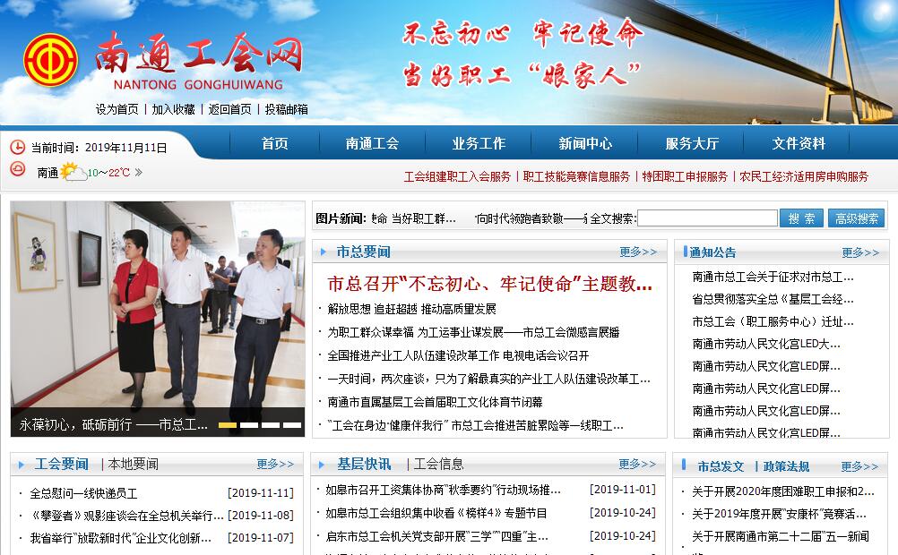 南通市总工会成立于1949年11月,下辖5个县(市)级工会,4个区级工会,16个产业(系统)、园区工会,9个集团公司工会和近100家市总直属基层工会。截至2016年末,全市共有基层工会1.9万家,涵盖法人单位5.01万个,会员总数227万人。近年来,南通市总工会在上级工会和市委、市政府的有力领导下,充分履行职责,树立了良好的社会形象。各级党政高度重视工会工作、全社会共同关心工会工作、广大职工群众大力支持工会工作,工会工作外部环境进一步优化、工会组织影响力进一步扩大。全市工会干部以昂扬的精神状态投入到工作中,勇于开拓,敢于创新,形成了百花齐放、争先创优的工作格局,创出了南通工会工作的特色品牌:全国率先将农民工纳入城镇住房保障体系;推行的“1+3”安全监控法,被交通部誉为全国交通行业的一面旗帜;连续37年开展“濠滨夏夜”广场文化活动,获得首批“全国特色文化广场”“全国工会制造十大品牌”、文化部“群星奖”等多项荣誉。南通市总工会是南通各级地方工会、产业工会的领导机关,受中共南通市委和江苏省总工会领导。其机关主要职责是:(一)根据党的基本理论、基本路线、基本纲领和工运方针,围绕党和国家工作大局,贯彻执行市委、省总工会的工作方针,指导全市工会工作。(二)依照法律和《中国工会章程》组织开展工会各项工作,组织和指导各级工会坚定不移地贯彻落实党的全心全意依靠工人阶级的根本指导方针,切实履行维护职工合法权益的基本职责。(三)向市委、市政府以及上级工会反映职工的思想、愿望和要求,提出意见和建议。对有关职工合法权益的重大问题进行调查研究,参与涉及职工切身利益的政策、措施、制度和有关法规、规章草案的拟订。参与职工重大伤亡事故和严重职业危害的调查处理。维护女职工的特殊权益。(四)负责工会理论政策研究。制定工会的组织制度和民主制度,研究指导工会的自身建设和改革。指导开展以职工代表大会为基本形式的民主选举、民主决策、民主管理和民主监督工作,推动建立集体协商、集体合同制度和监督保证机制,完善劳动关系协调机制。提高职工的思想道德和科学文化技术素质。(五)协助县(市)区党委和市有关部门、企业、部省属单位党组(党委)管理县(市)区总工会和市区产业、集团公司工会的领导干部。研究制定工会干部的管理制度和培训规划,负责全市镇街以上工会和大型企事业工会领导干部的培训工作。抓好市总工会机关和直属单位党员干部党风廉政建设工作。(六)依法对安全生产工作进行监督,协助政府有关部门指导职工生活、社会保障等方面的工作。组织和指导职工开展劳动和技能竞赛以及合理化建议、技术创新、技术协作活动。(七)会同市有关部门共同做好劳动模范和先进工作者的推荐、评选、表扬、培养工作,并负责日常管理。负责五一劳动奖章(奖状)、工人先锋号获得者的推荐、评选、表扬和管理工作。(八)负责工会经费和工会资产的管理、审查、审计工作。研究拟订工会组织兴办的职工劳动福利事业的有关制度和规定,并进行指导、协调。(九)负责市工会系统的对外交流,发展同港、澳、台工会的联系。(十)承担市委、市政府及省总工会交办的其他事项。