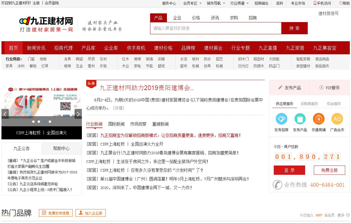 | 网站简介: 九正建材网是建材行业门户网站、行业电子商务网站50强,提供专业建材行业资讯、建材商机、建材招商、建材企业及产品,是建材企业网络营销的平台。九正科技是一家集团化的公司,十八年专注于建材家居行业,致力于用先进的互联网技术、VR/AR场景技术、软硬件技术给传统工厂、卖场、经销商赋能,提供一揽子新零售解决案,让天下没有难做的建材生意!主推的九正家居智慧云店帮传统建材家居厂商、门店、卖场提供变革的核动力,提供销售的放大器。 |