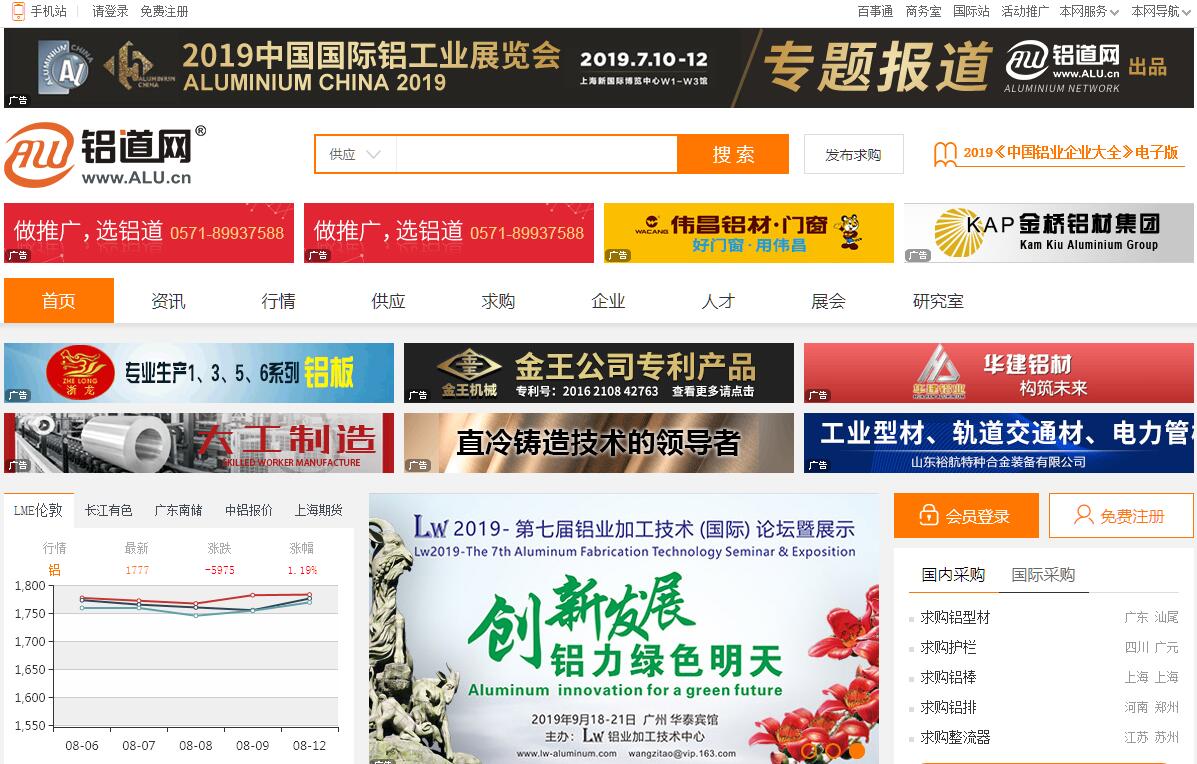 | 网站简介: 铝道网 China Aluminium Network,成立于2002年,是杭州商易信息技术有限公司(http://www.needindex.com)全力为铝行业打造的铝行业垂直门户网站,旗下有中文站(www.ALU.cn)和国际站(www.ALU.com.cn )同时也是行业网络媒体,主要栏目:行情、咨询、供应、求购、企业、人才、展会、研究室等,16年聚焦“互联网+铝业”,铝道网致力于打造铝生态圈互联网铝产业上下游,并为铝行业企业提供一站式互联网解决方案。 |