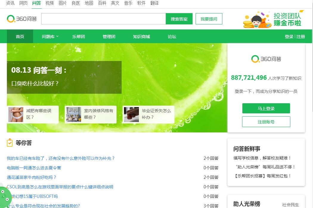 | 网站简介: 微知识,大帮助——360问答是一个互动知识分享社区,网友们可以把自己工作、生活中遇到的问题提交给360问答,360问答会匹配到最适合的回答者来解答问题。解决后的问题可以被使用360搜索的其他用户搜索到,帮助更多人解决类似的问题。 |